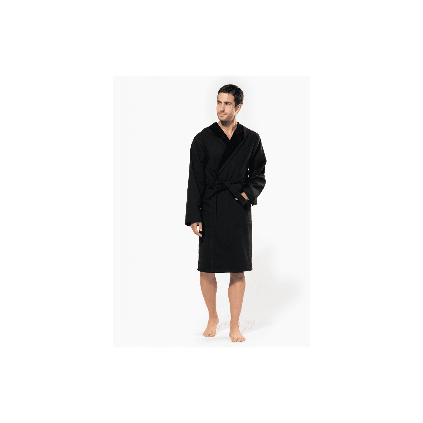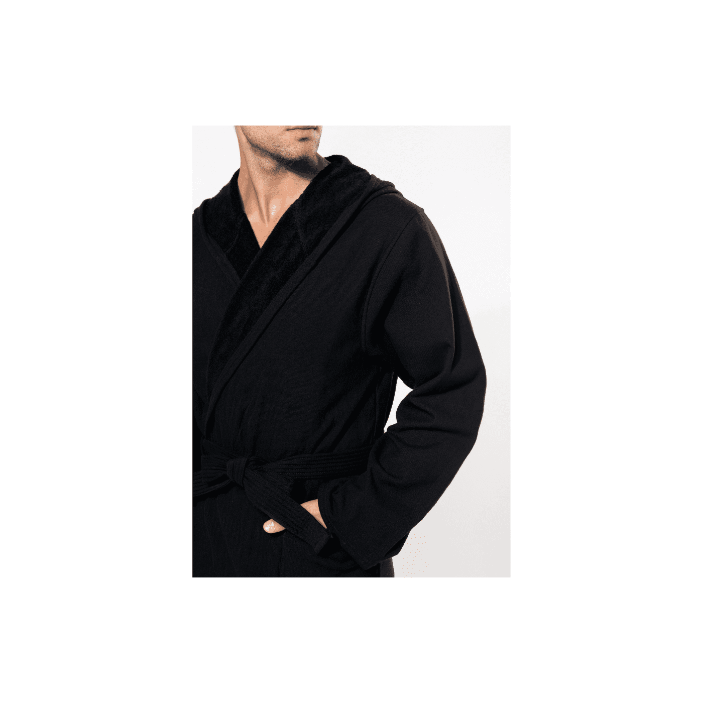 The Kariban K140 bathrobe is a comfortable and soft hooded bathrobe made from organic cotton. It belongs to the Organic collection and has GOTS, OEKO-TEX and VEGAN certifications. Available in different sizes and colors, this bathrobe offers a pleasant touch and is designed with details such as two patch pockets, a waist with belt loops and a double stitching finish on the hood, cuffs and hem of the garment.