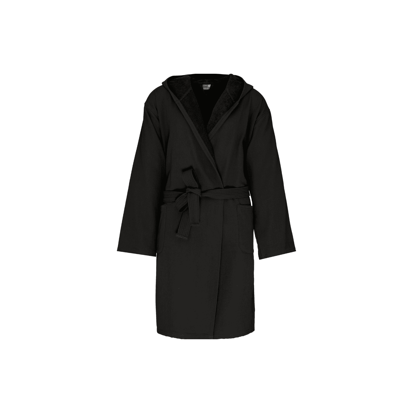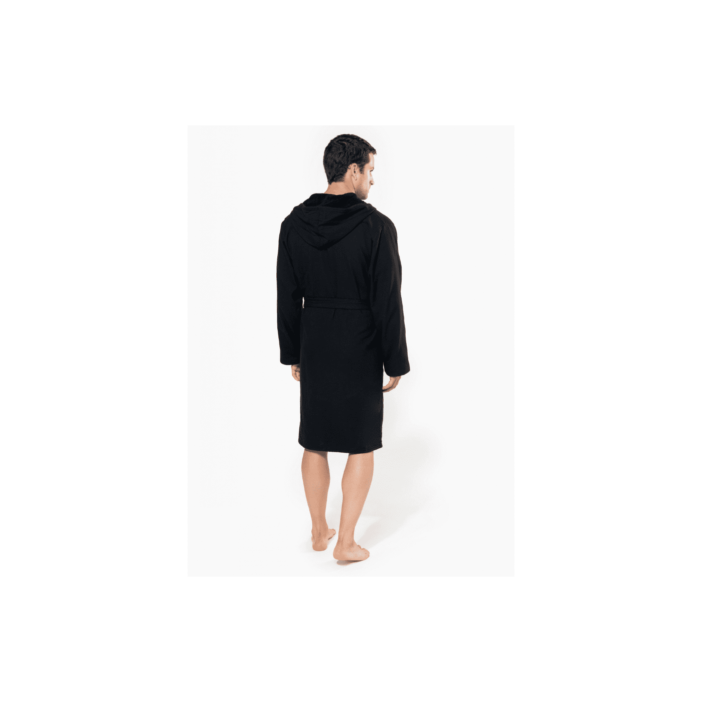 The design of the bathrobe includes a waist with belt loops, allowing it to be adjusted according to the user's preferences. It also has a hanging strap on the inside of the neck, making it easy to store. The edge of the hood, cuffs and hem of the garment have a double-stitched finish, which guarantees durability.