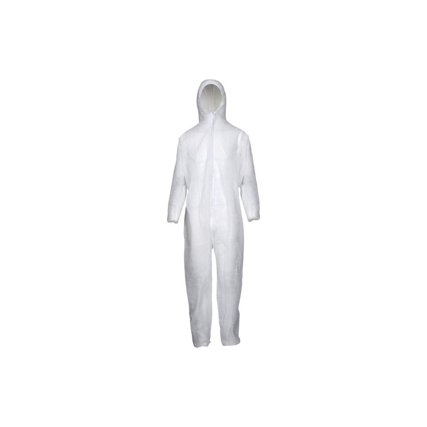 Integral disposable coverall with hood and lightweight and highly breathable composition.