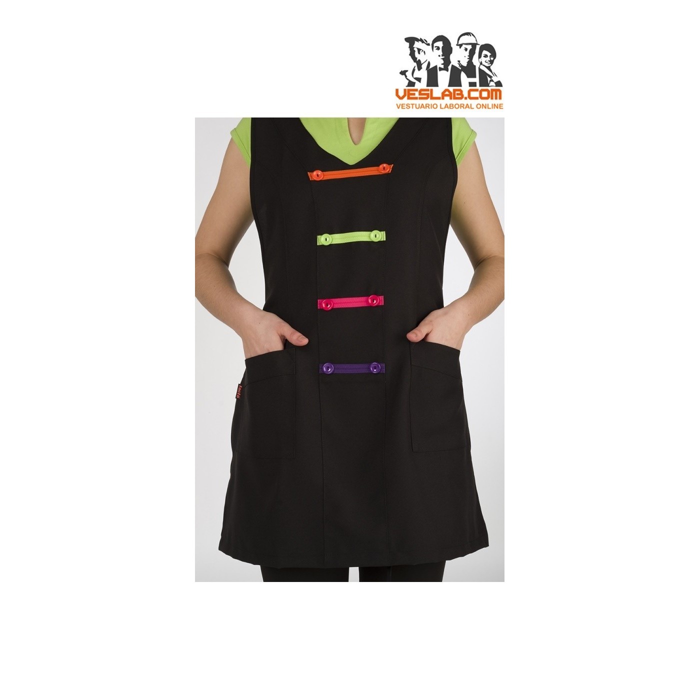 V-neck stole, front with selvedges and pockets, center piece with colored belt loops with buttons, back with tweezers, armholes trimmed with vivid, waist adjustment with ribbons that cross at the back and knot at the waist.