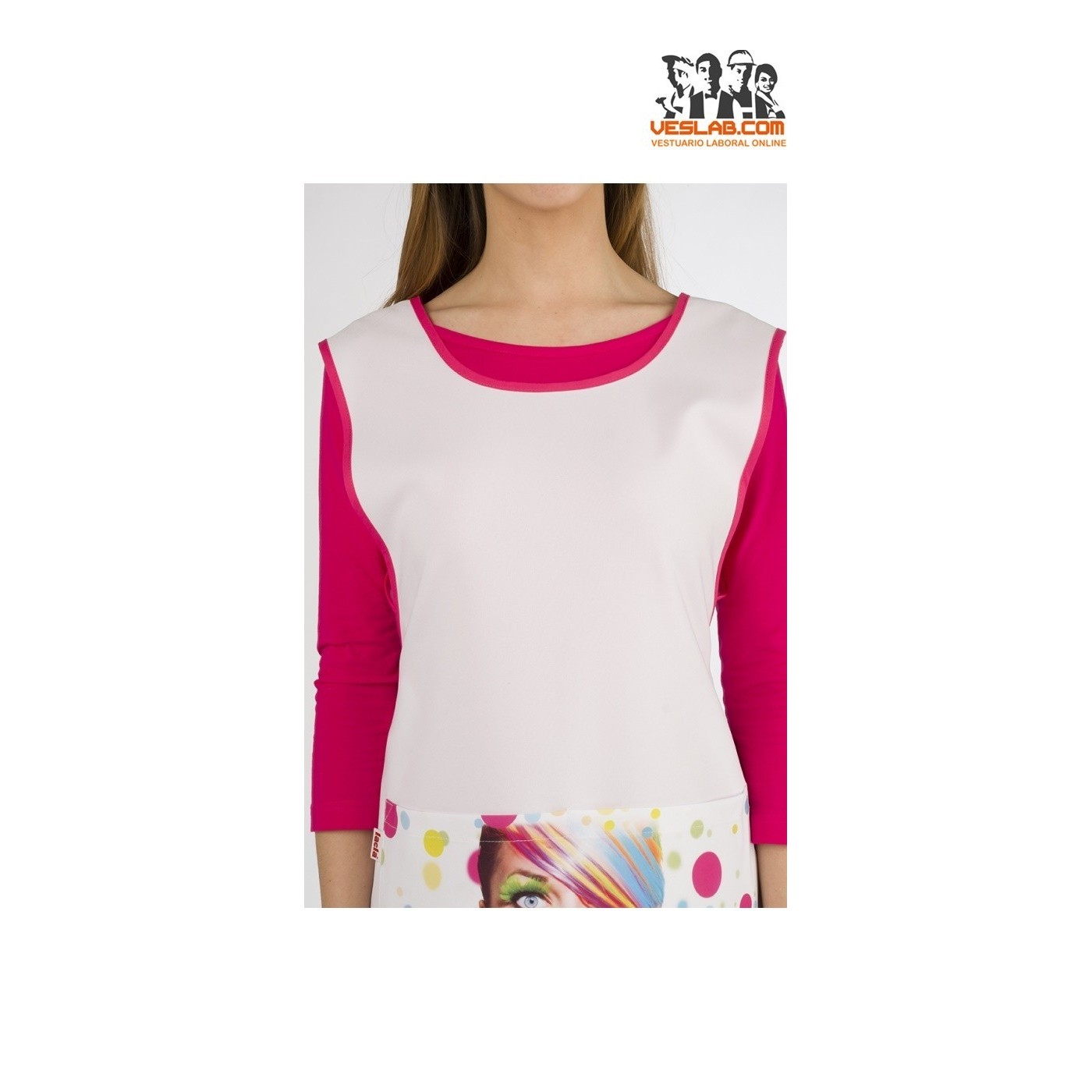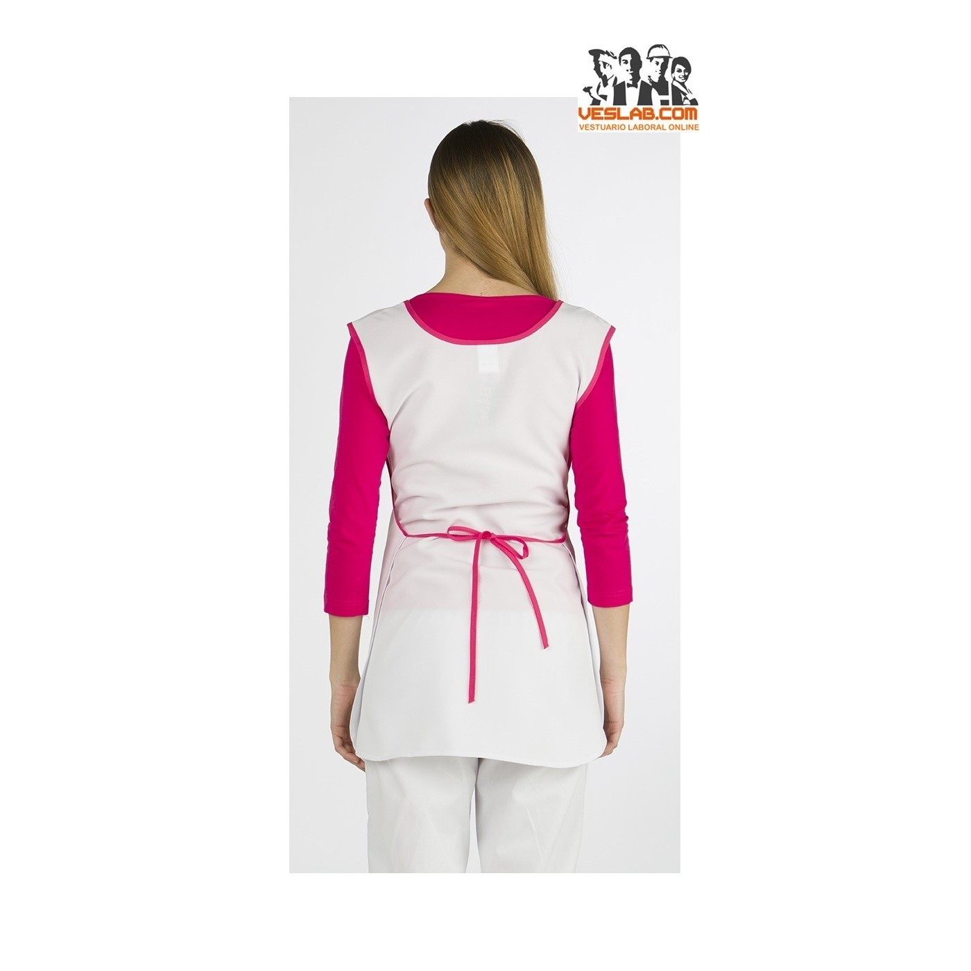 Stole tight, with round neckline and polished armholes with vivid color, smooth front with stamped central divider pocket, round bottoms, waist adjustment with ribbons that cross at the back and are knotted at the waist.