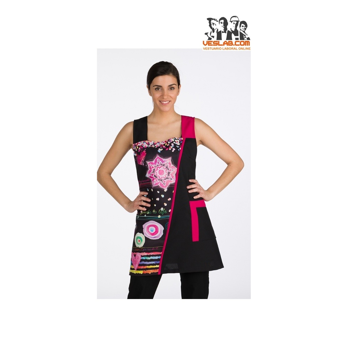 Stole square neckline, 1 front diagonal stamped, vivid color stitching, double color pocket, two-tone braces, waist adjustment with colored ribbons that cross at the back and knotted at the waist.