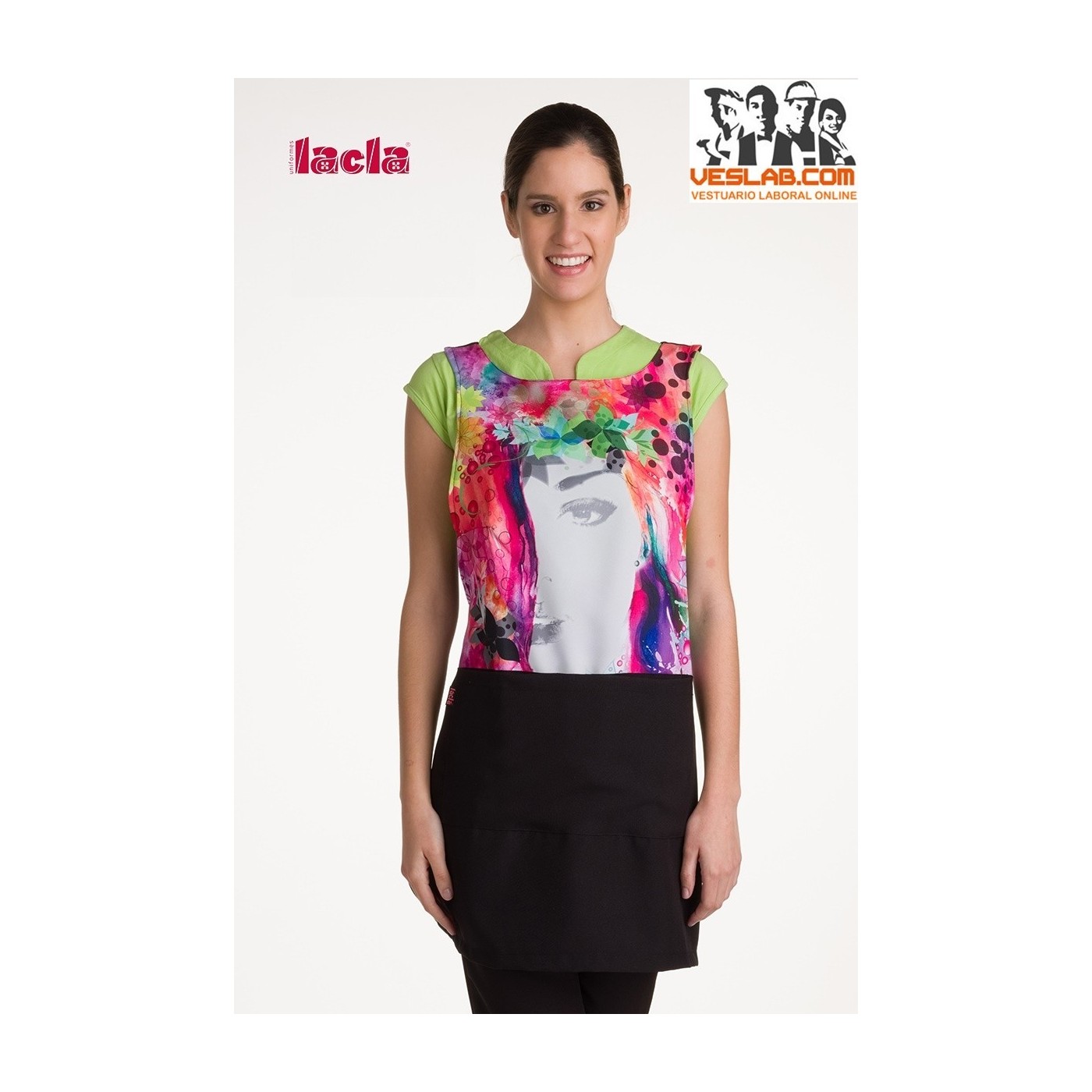 Fur collar . with round neckline. front with printed yoke and flat pockets. back with tweezers. Fit waist with ribbons that cross at the back and knot at the waist.