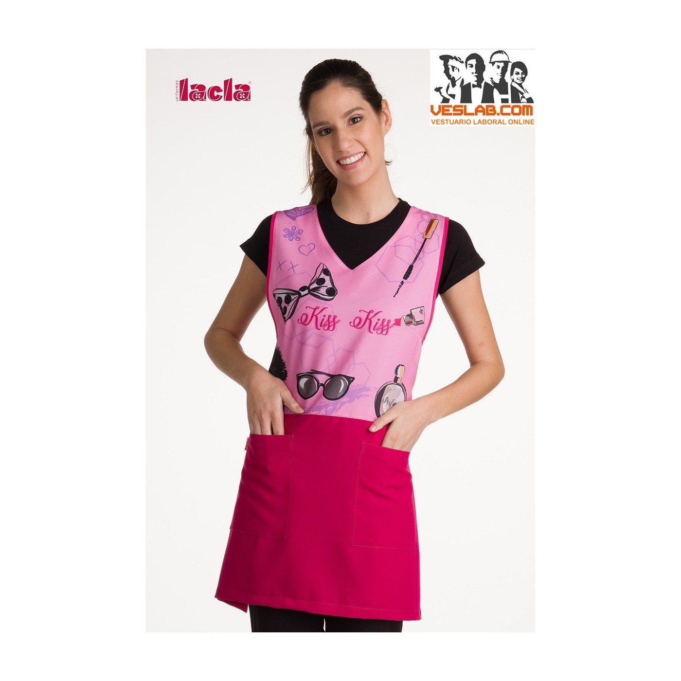 Stole peak neckline. front with printed yoke with smooth pockets and armholes with vivid color. Fit waist with ribbons that cross at the back and knot at the waist.