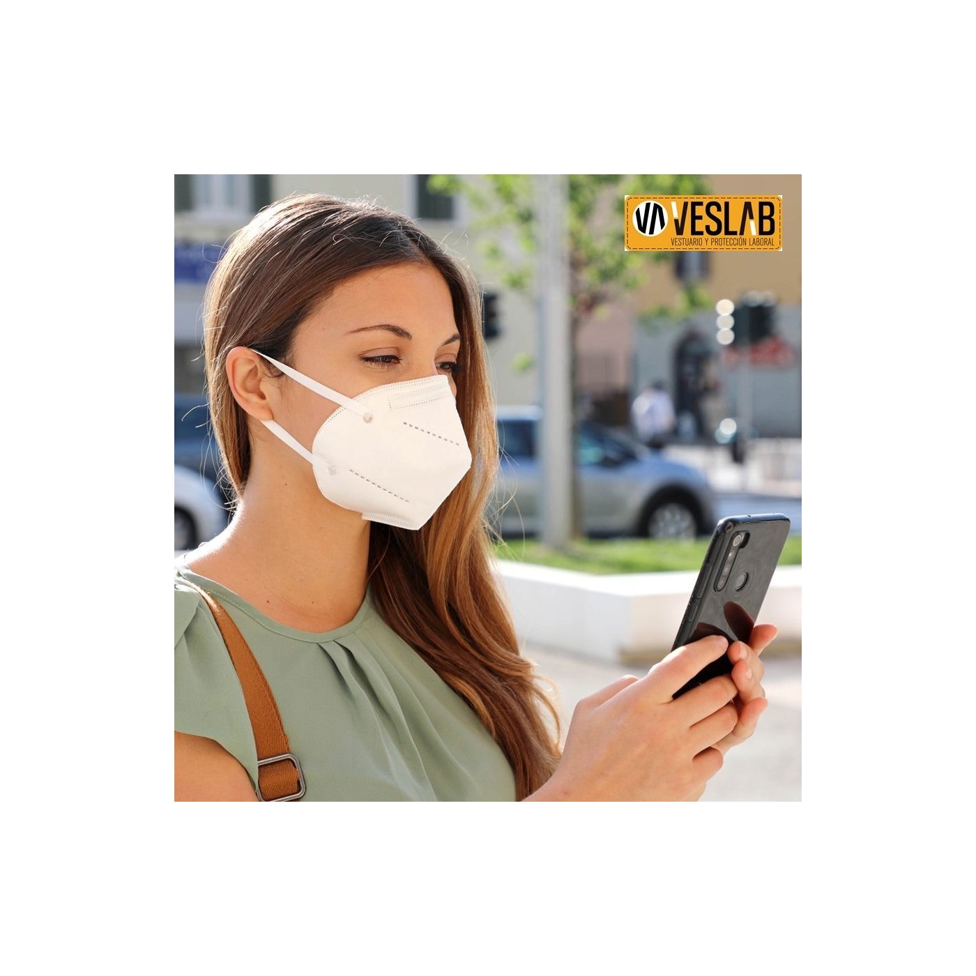 FFP2 self-filtering protection and safety mask in white. With double protection, both for the wearer of the mask and for the people around. 5-layer construction and heat-sealed finish, including matching elastic fixation bands, adaptable nose clip for a firm fit, and white skull adjuster.