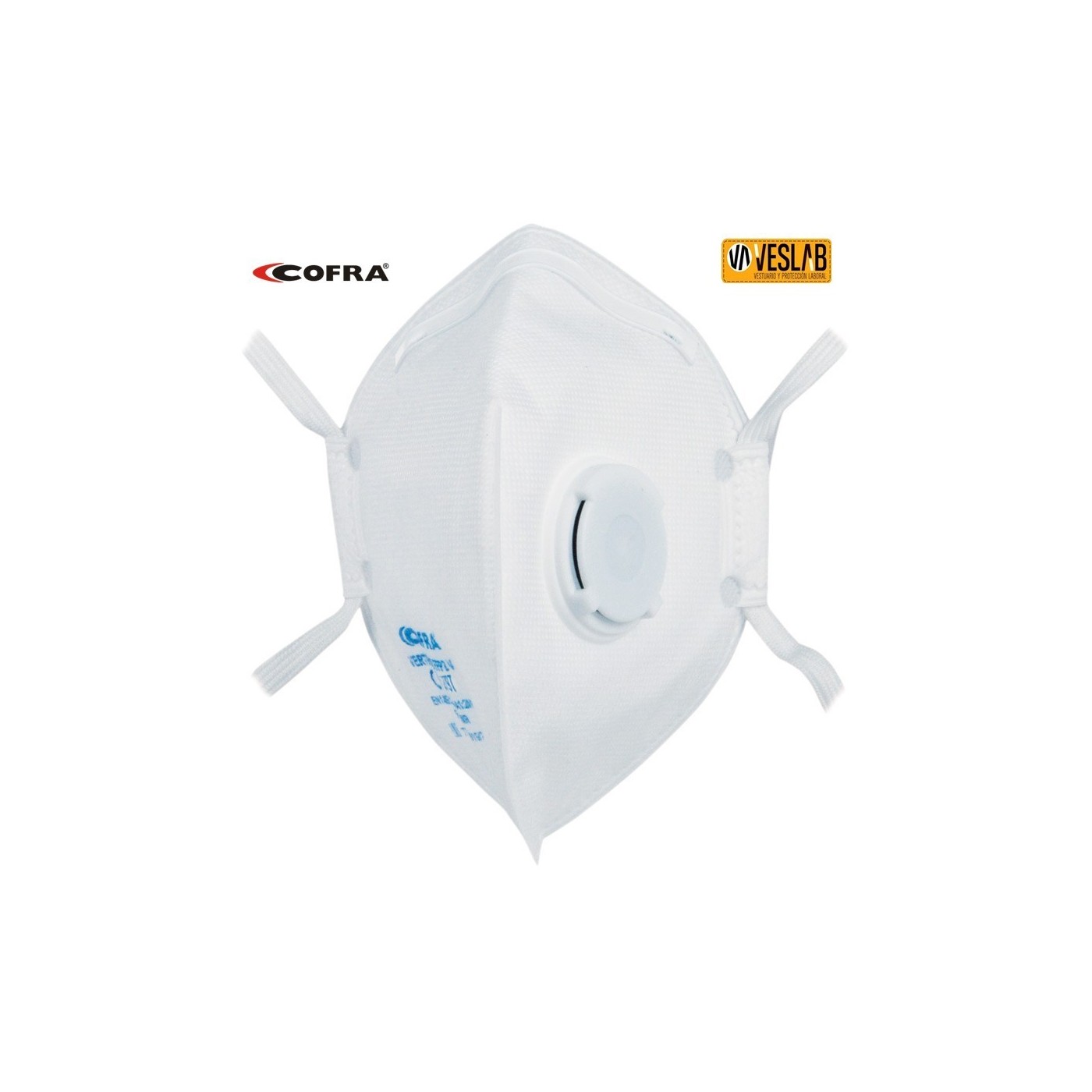 La màscara VERTIFLAT FFP2 V de COFRA és plegable i vertical, proporcionant un ampli camp visual, adherència facial efectiva i confort adequat. Compleix la norma EN 149:2001+A1:2009 i ofereix protecció contra pols, fums i boires. Aquesta versió inclou una vàlvula d'exhalació per facilitar-ne la respiració. La màscara està disponible en mida única i es presenta en diferents opcions d'embalatge. Els elàstics lliscants permeten penjar la màscara al voltant del coll quan no es fa servir. No conté parts metàl·liques exposades i el clip nasal exterior de metall amb revestiment de plàstic flexible permet una regulació adequada. L'estructura i els materials utilitzats són duradors i resistents al col·lapse en entorns humits.