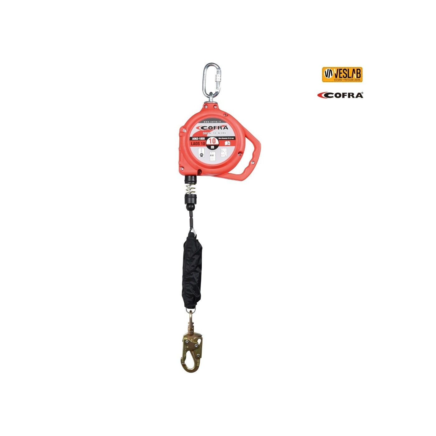 LAOS 10 M - Retractable type device with integrated braking system and energy absorber. Certified for horizontal use on sharp edges with 120 kg mass. Galvanized steel cable. Equipped with a steel base connector and steel termination connectors with drop indicator and SWIVEL.