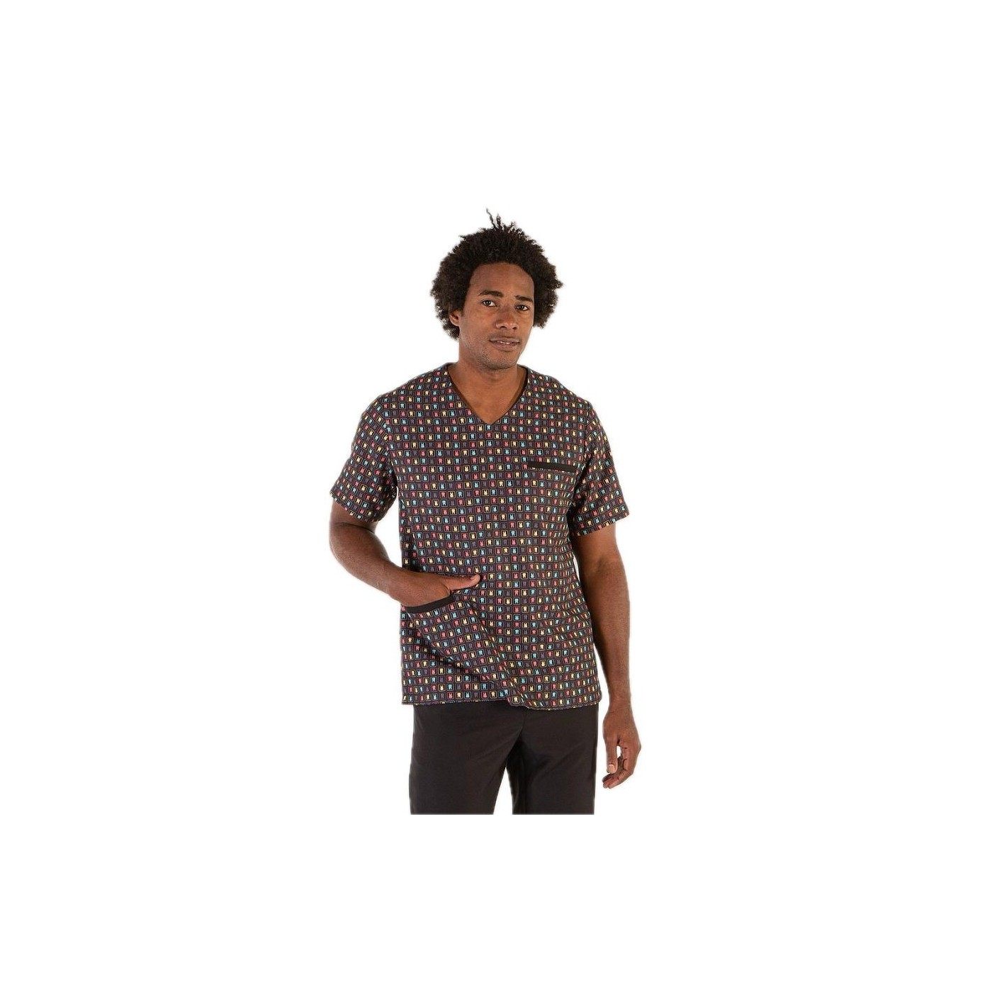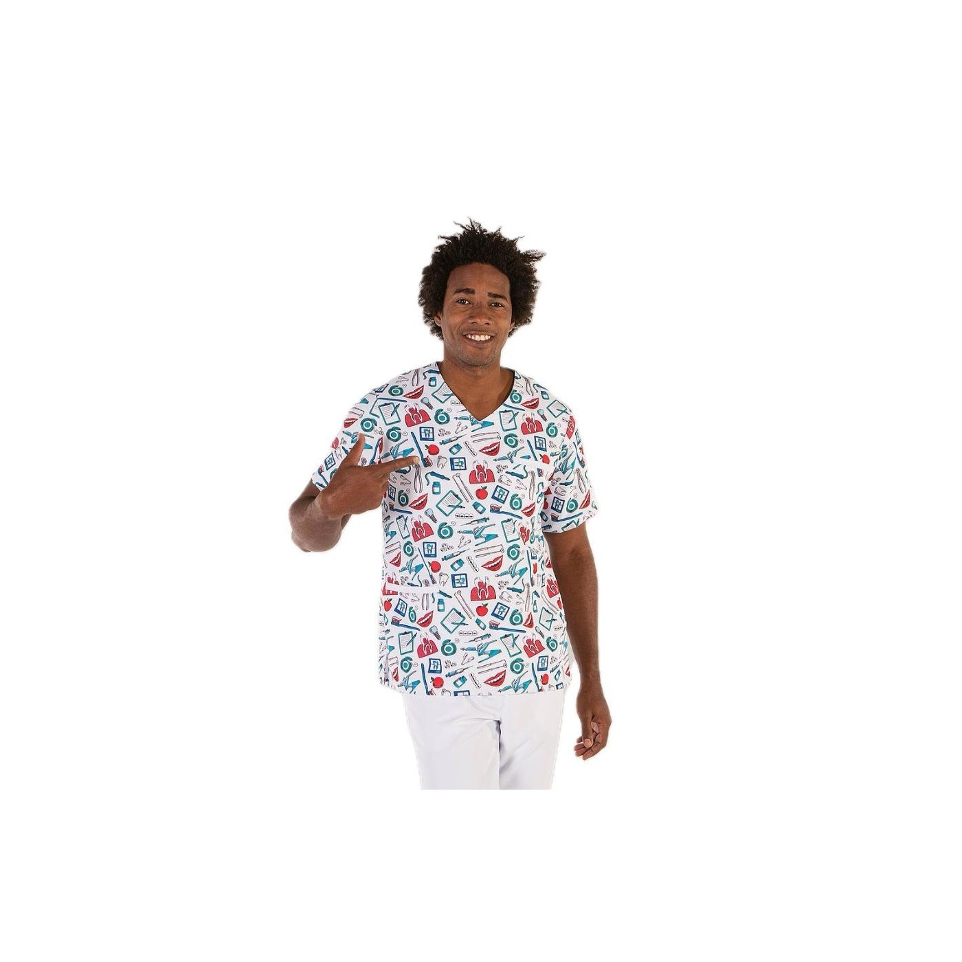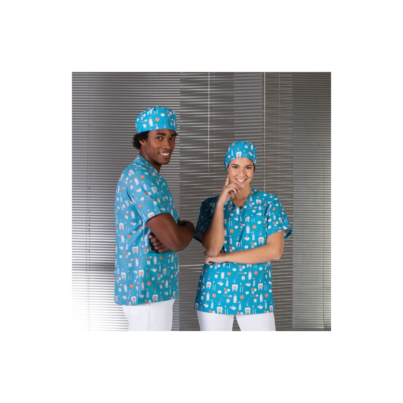 Dentist's printed tunic made of microfiber, unisex and short-sleeved, crafted from antibacterial and bleach-resistant fabric. Offers superior mobility with a semi-fitted design, side slits, and strategic pockets. Washable at 90º, quick-drying, and repels hair and pet fur.