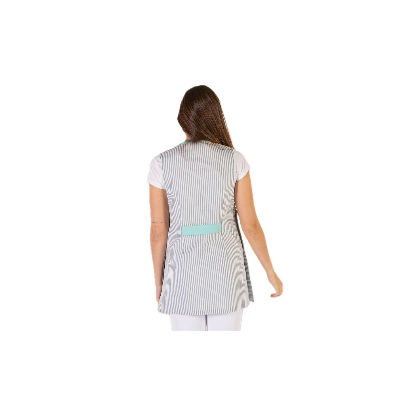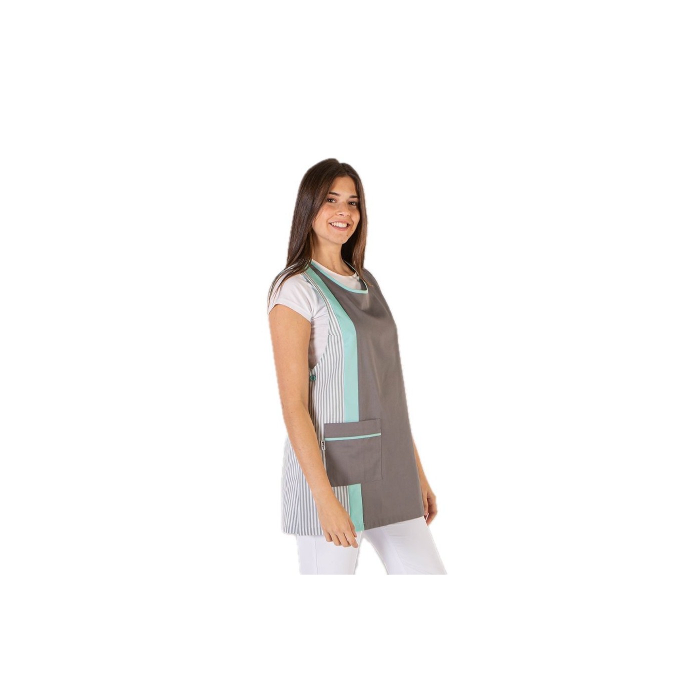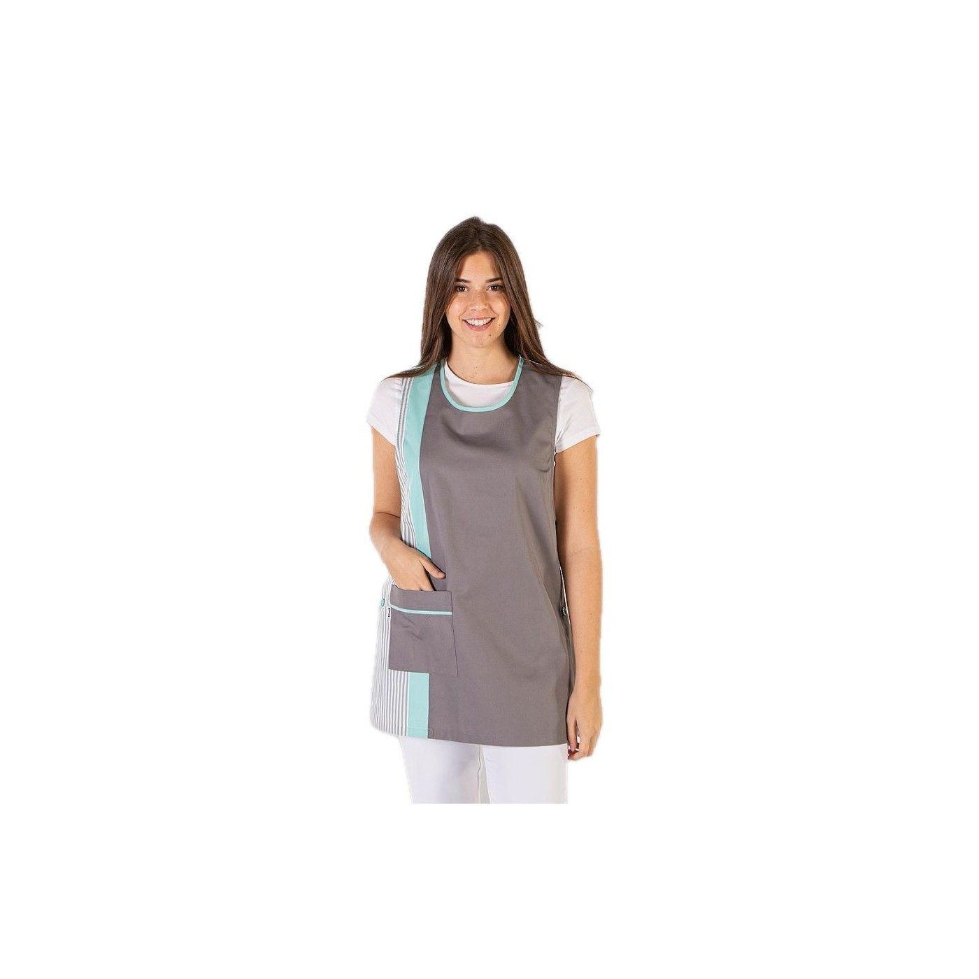 The JIMENA pinafore dress is a sleeveless, loose-fitting garment that combines comfort and freedom of movement. With a pocket on the right front and side slits, this overalls is ideal for active work in cleaning or retail environments.
