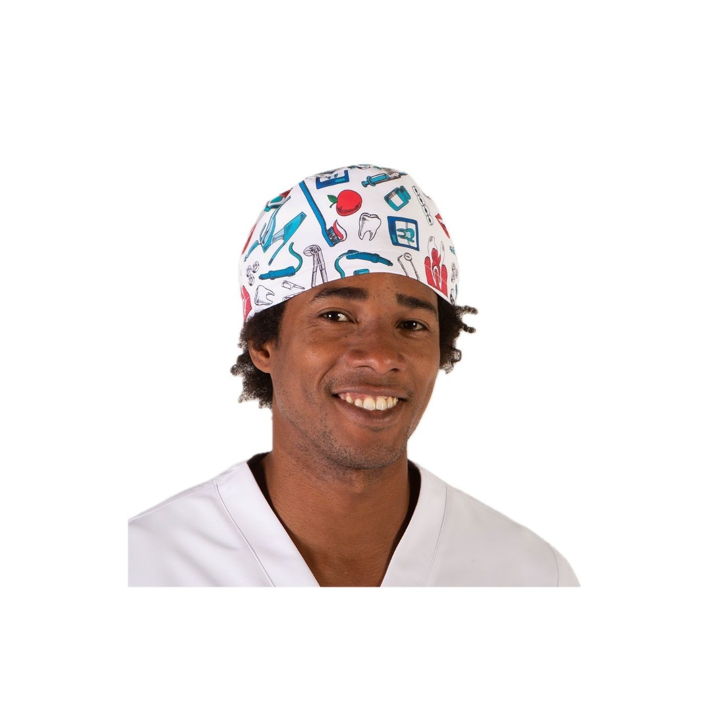 Dentist Cap in Microfiber Gary's, made of 100% soft polyester and stain-resistant, with adjustable back elastic or ties for a secure fit and an absorbent terry band.