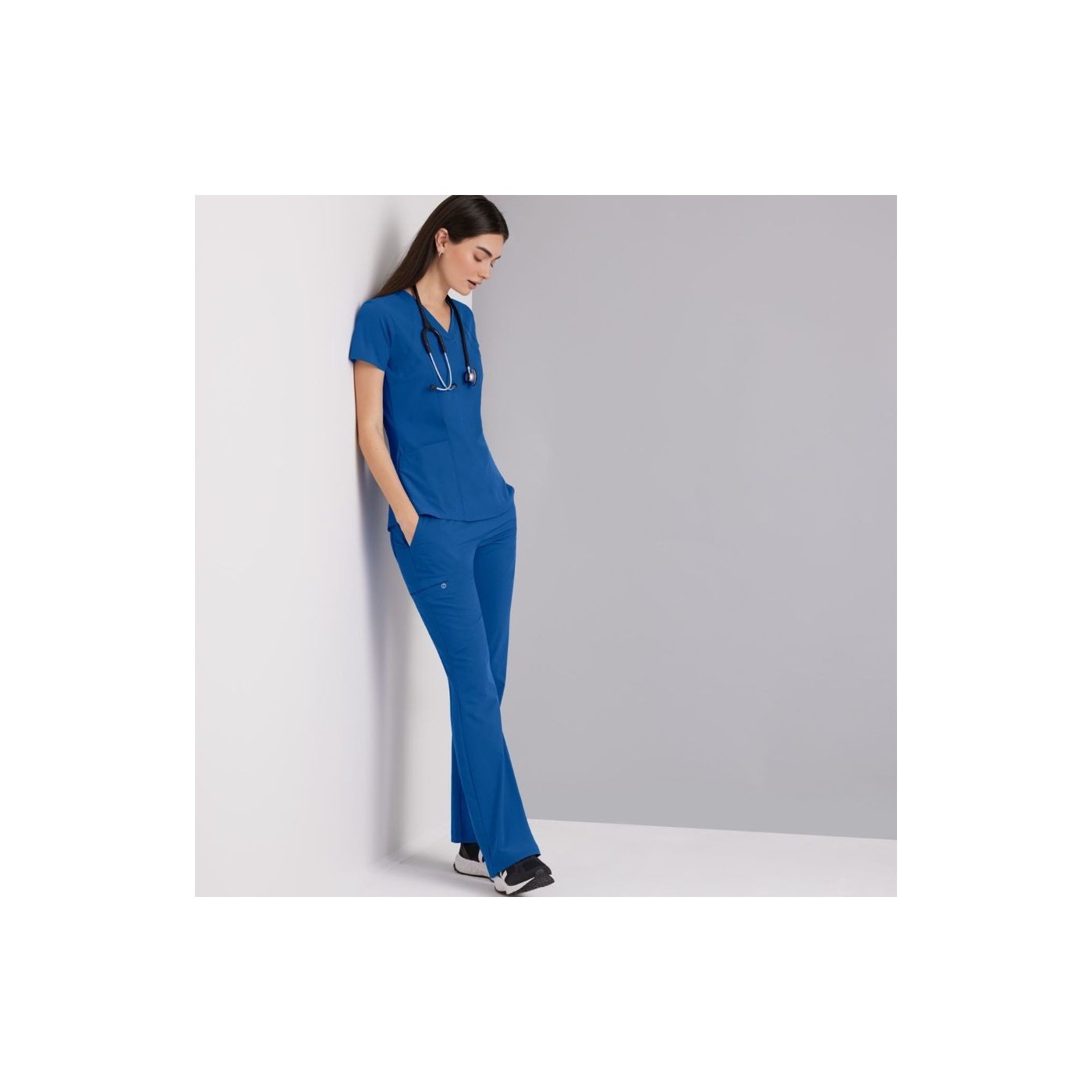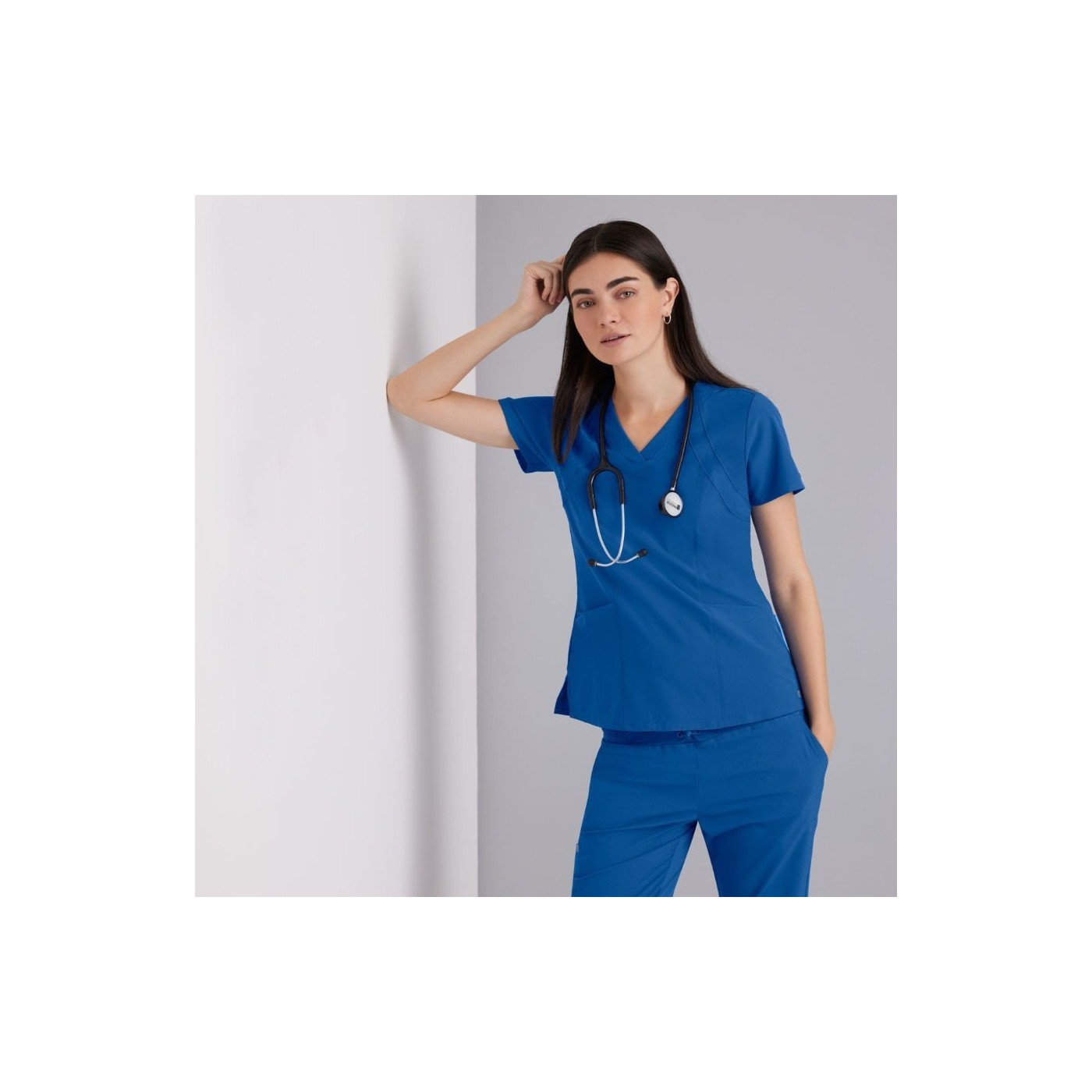 The RACER medical scrub top by BARCO offers comfort with its four-way stretch fabric, wrinkle and stain-resistant, featuring anti-static and sustainable technology, made with 5 recycled bottles. Ideal for professionals on the move.