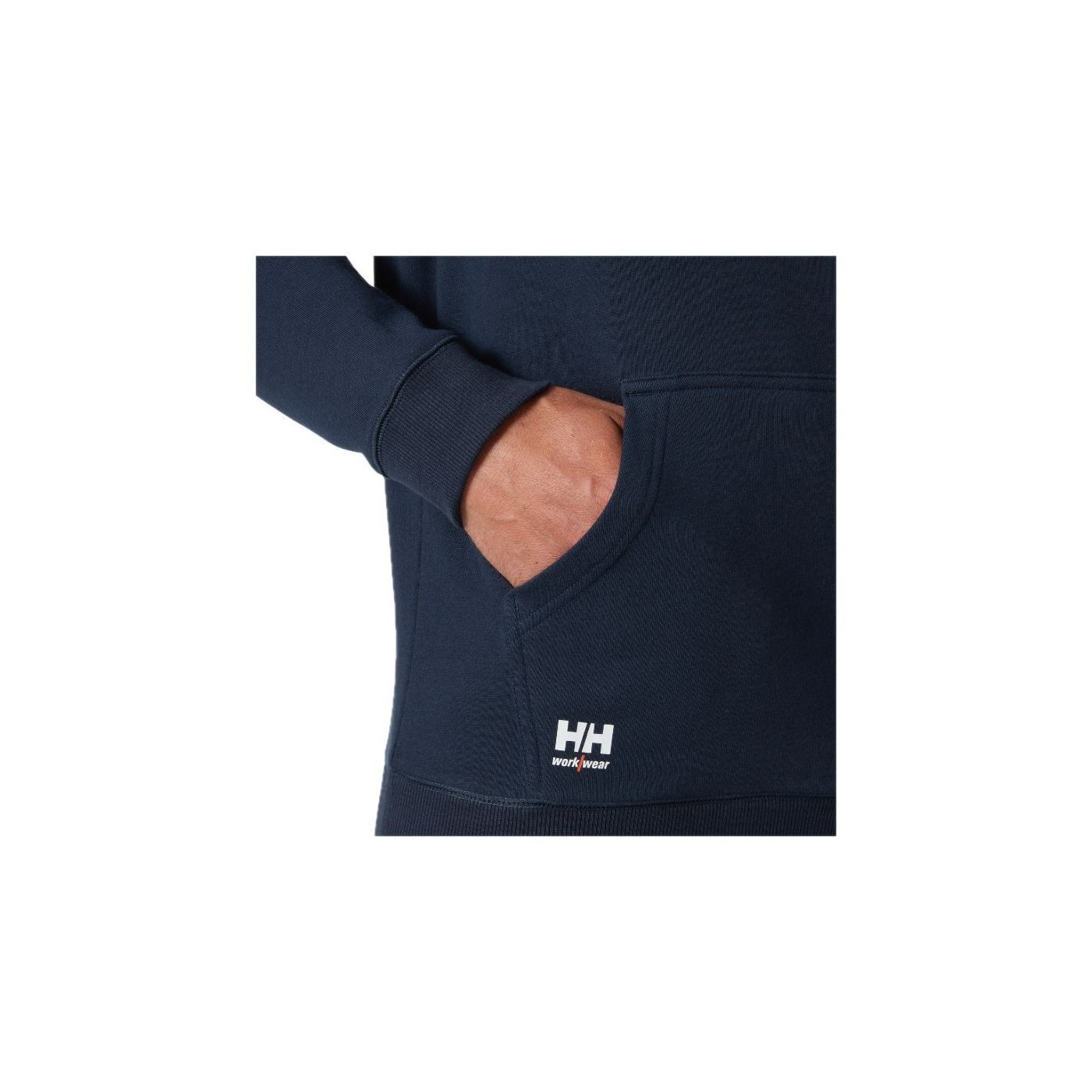 The Manchester hoodie from Helly Hansen Workwear, made from 100% cotton, offers comfort and style with its adjustable hood, front hand-warming pocket, and ribbed cuffs.