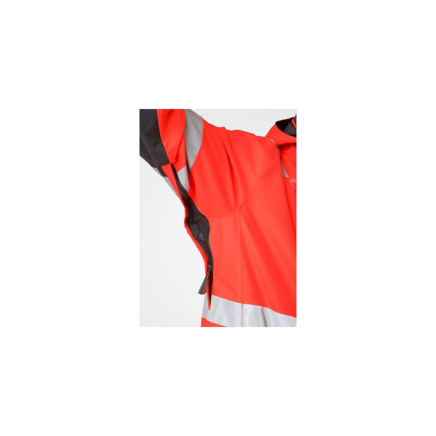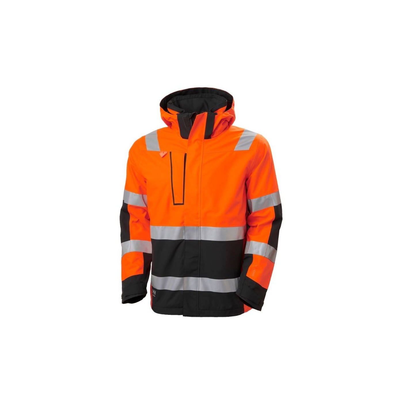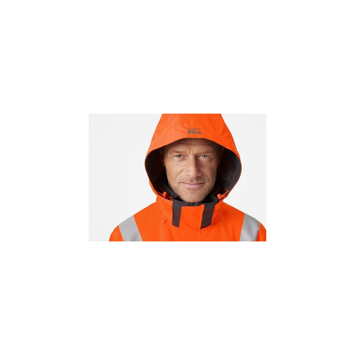 EN ISO 20471 Class 3 EN 343 3.3 Helly Tech® Performance Sealed seams No seams on the shoulders Detachable hood Hood with adjustment by girdle and velcro Designed for helmet use YKK® central zipper on the front with flap YKK® zip chest pocket Life Pocket ™ Interior pocket for tablet Ventilation zippers in armpits YKK® Loop for identification card YKK® zippered hand pockets Reflective in body and sleeves Ergonomic sleeves