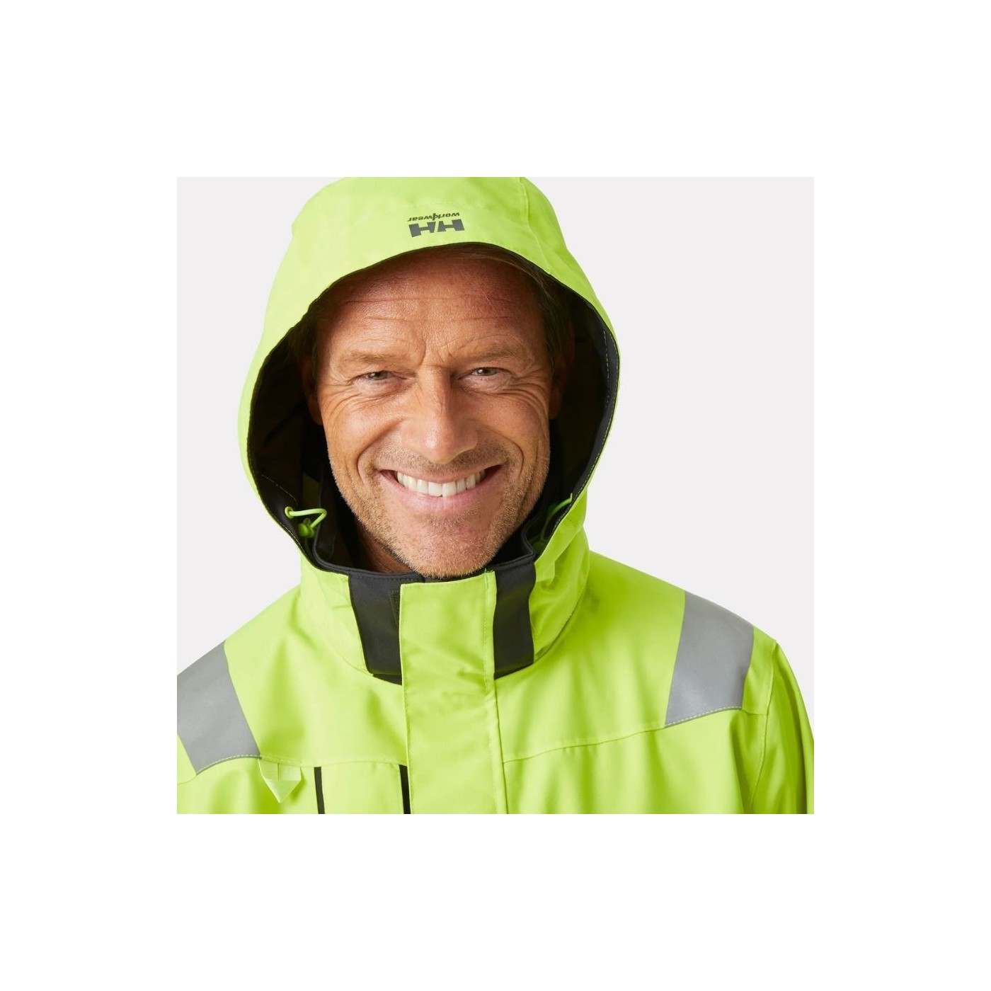 The Alna 2.0 waterproof shell jacket by Helly Hansen Workwear combines advanced waterproofing (HELLY TECH® PROFESSIONAL), certified high visibility (EN ISO 20471), and functional design with a detachable hood, underarm ventilation, and multiple zippered pockets. Perfect for demanding jobs.