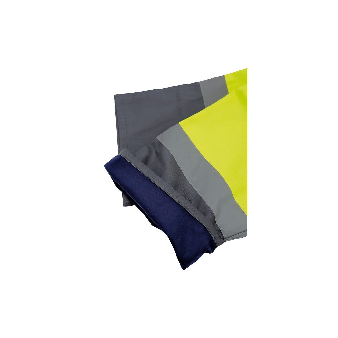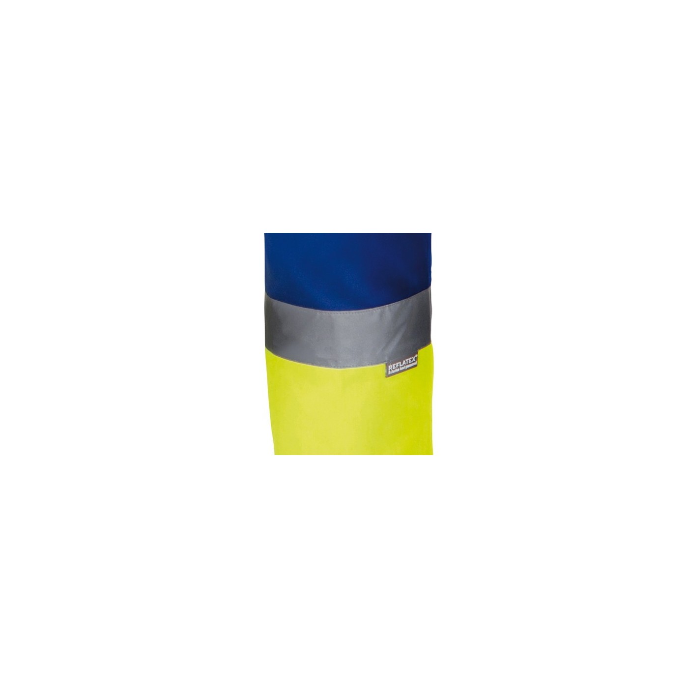 Two-color high visibility trousers with two reflective ribbons on the legs and a fluorine band between them. With tweezers, elastic waist and six pockets, four of them with covers and velcro closure. Lined.