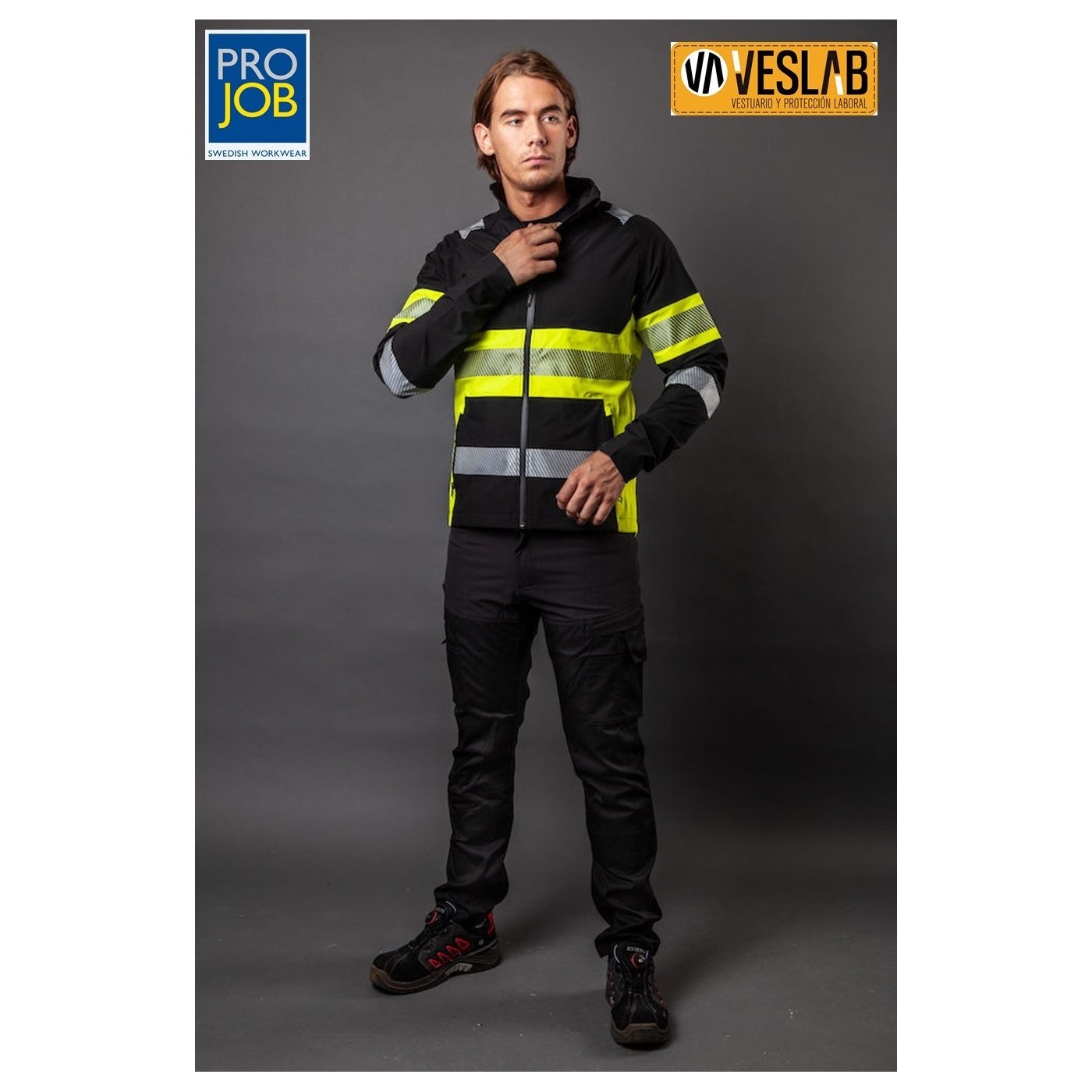 Excellent high visibility wind resistant and water repellent Projob jacket in lightweight stretch material.