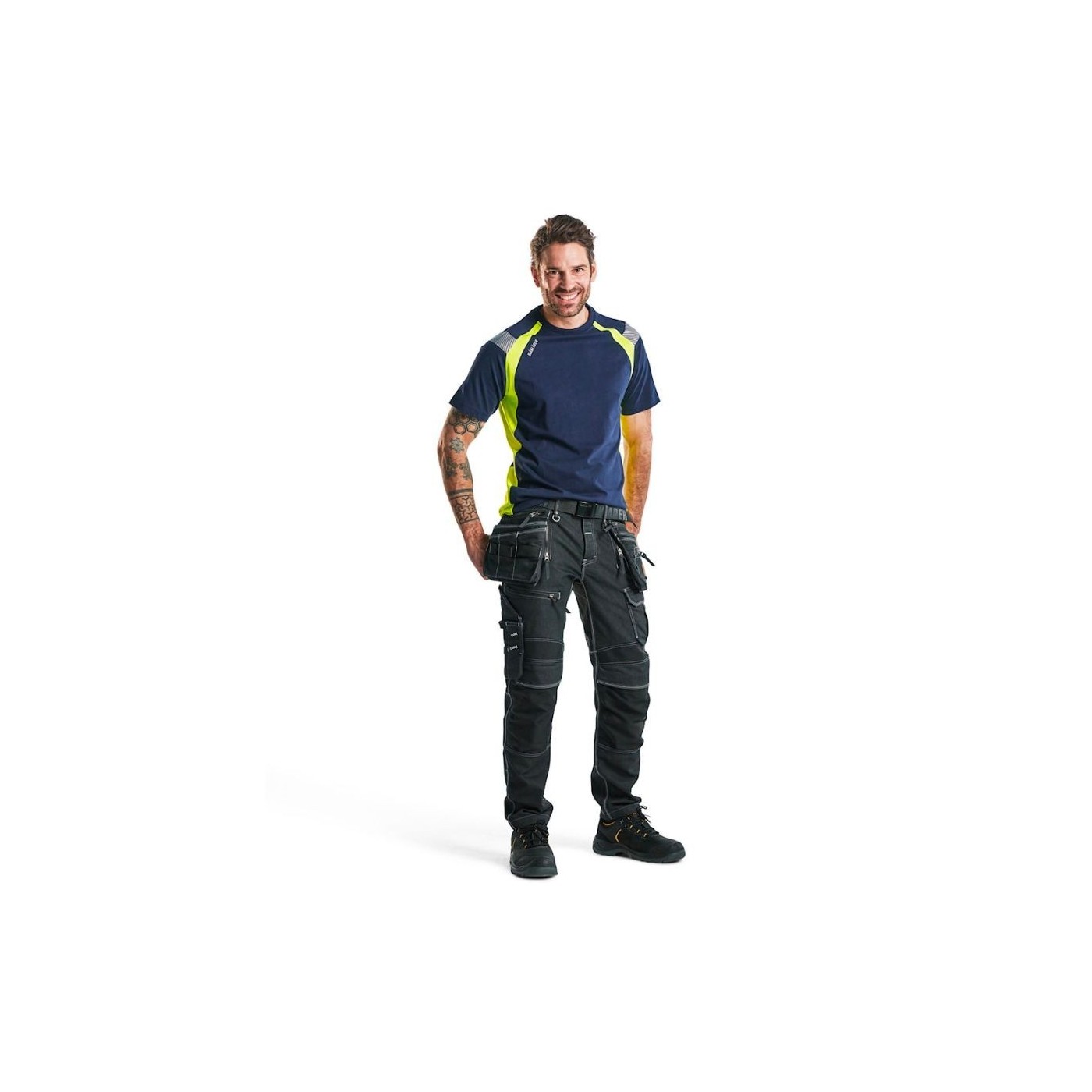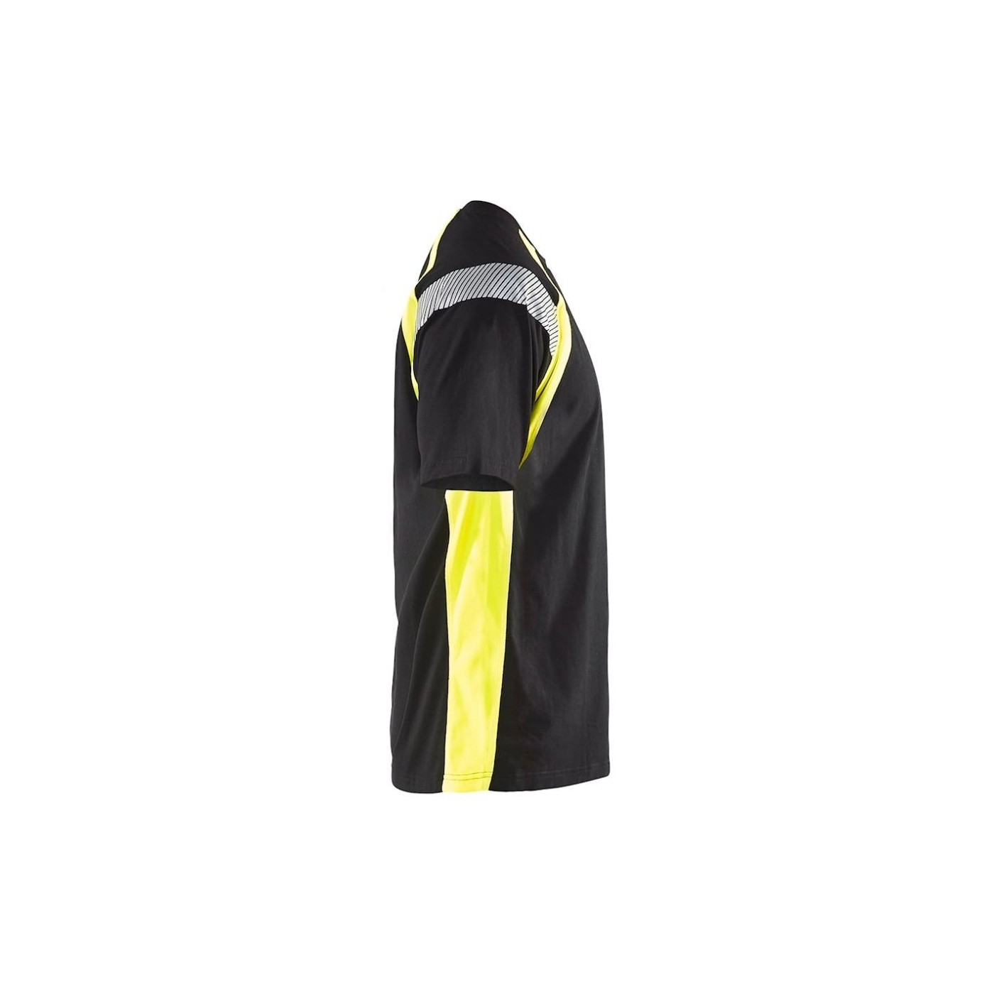 Blaklader High Visibility T-shirt with 100% cotton design for comfort in dark areas. Fluorescent polyester panels ensure increased visibility. Features reflective tape on shoulders and round neck for regular fit. High visibility certification not applicable.