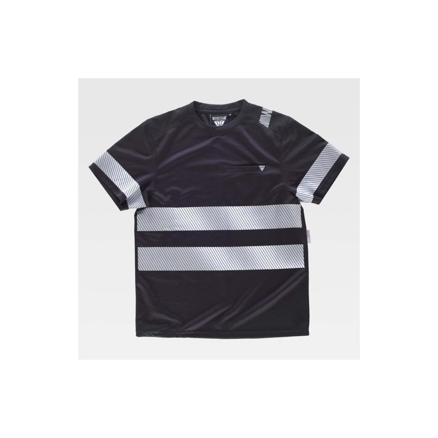 Short-sleeved micropiqué polyester T-shirt with segmented reflective strips for maximum visibility. Breathable, lightweight, and quick-drying fabric. Ideal for jobs that require safety and comfort.