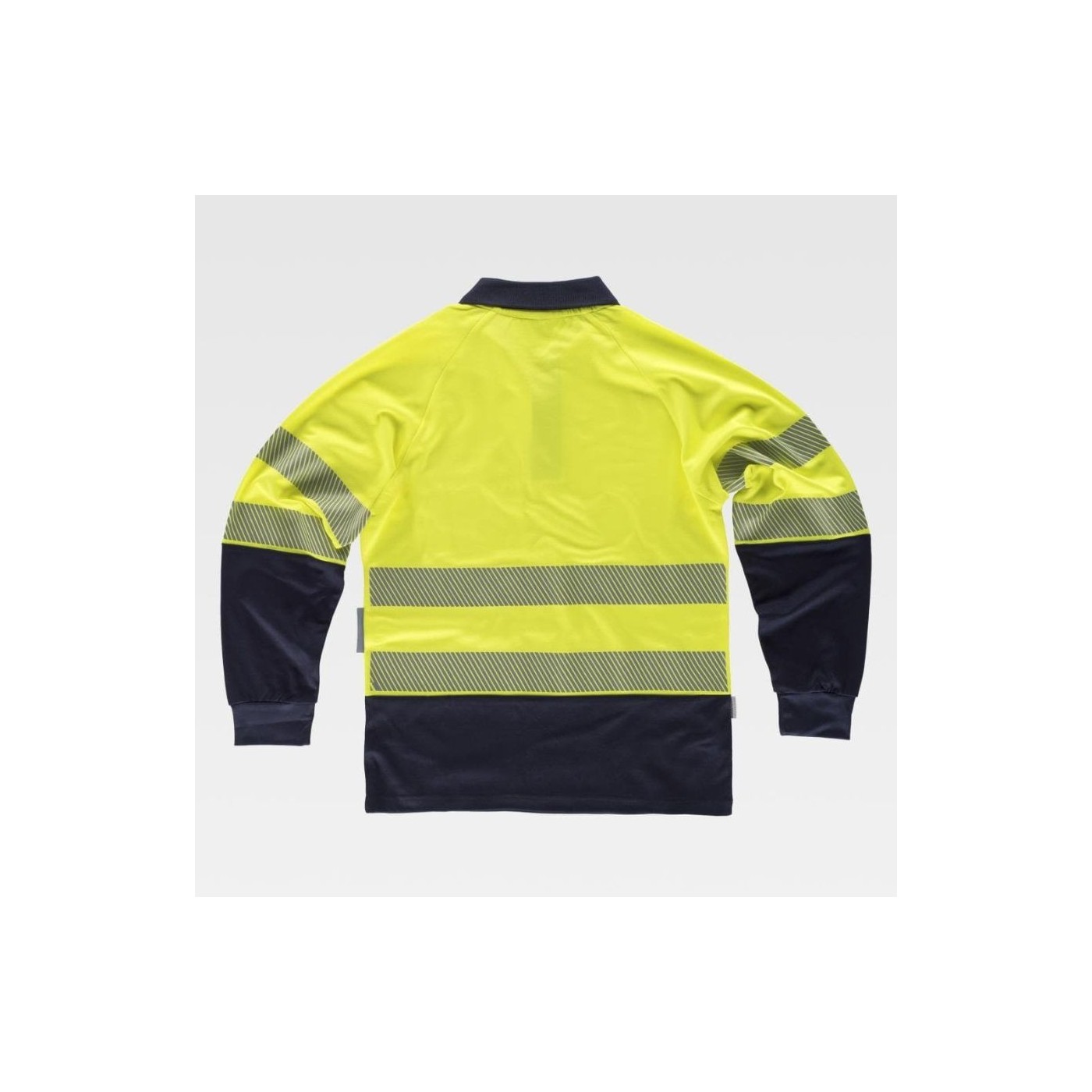 High-visibility, two-tone, long-sleeved polo shirt in polyester micropiqué with high visibility and reflective details. It features mesh underarms for breathability, a classic collar with a three-button placket, and a chest pocket. Ideal for work environments that require safety and comfort.