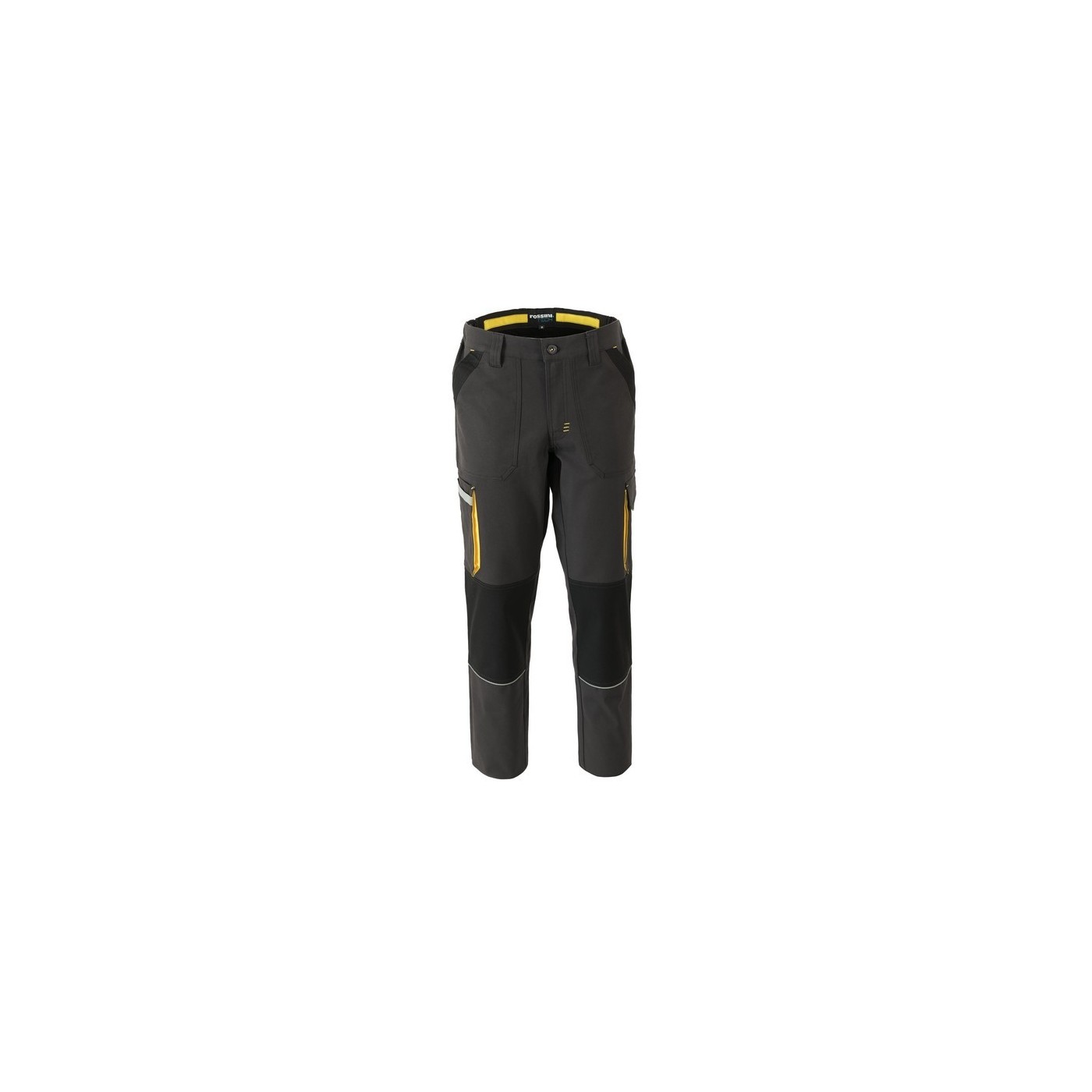 Elastic side waist and belt loops, two large front pockets with contrasting external reinforcement, multi-function bellows side pocket with reflective band, side bellows pocket with velcro closure, back pocket with flap and velcro, contrasting fabric reinforcements in the knees, contrast inserts.