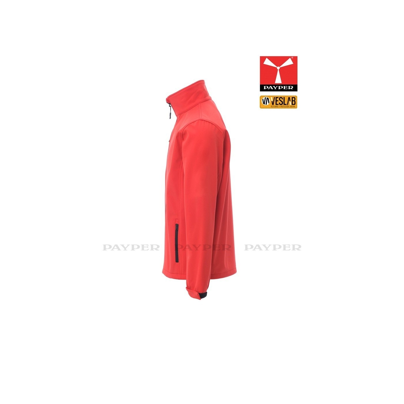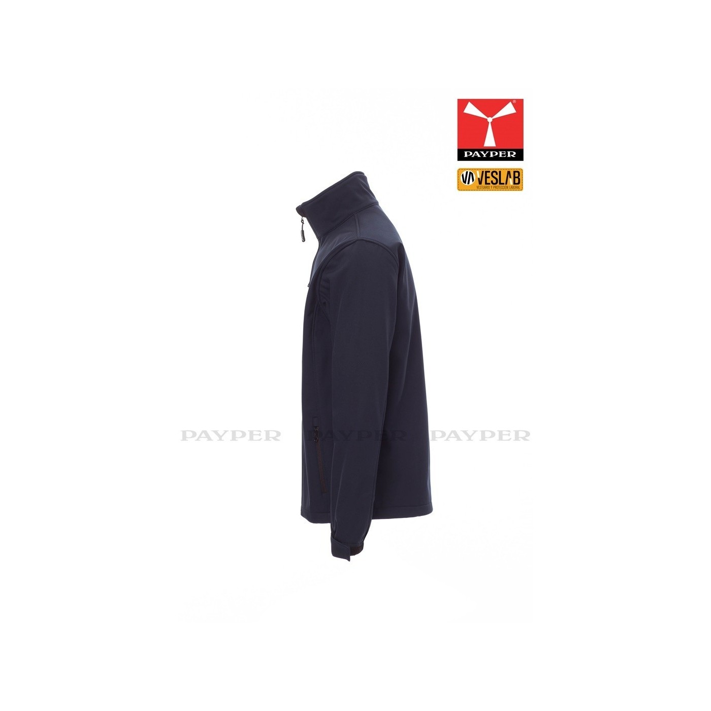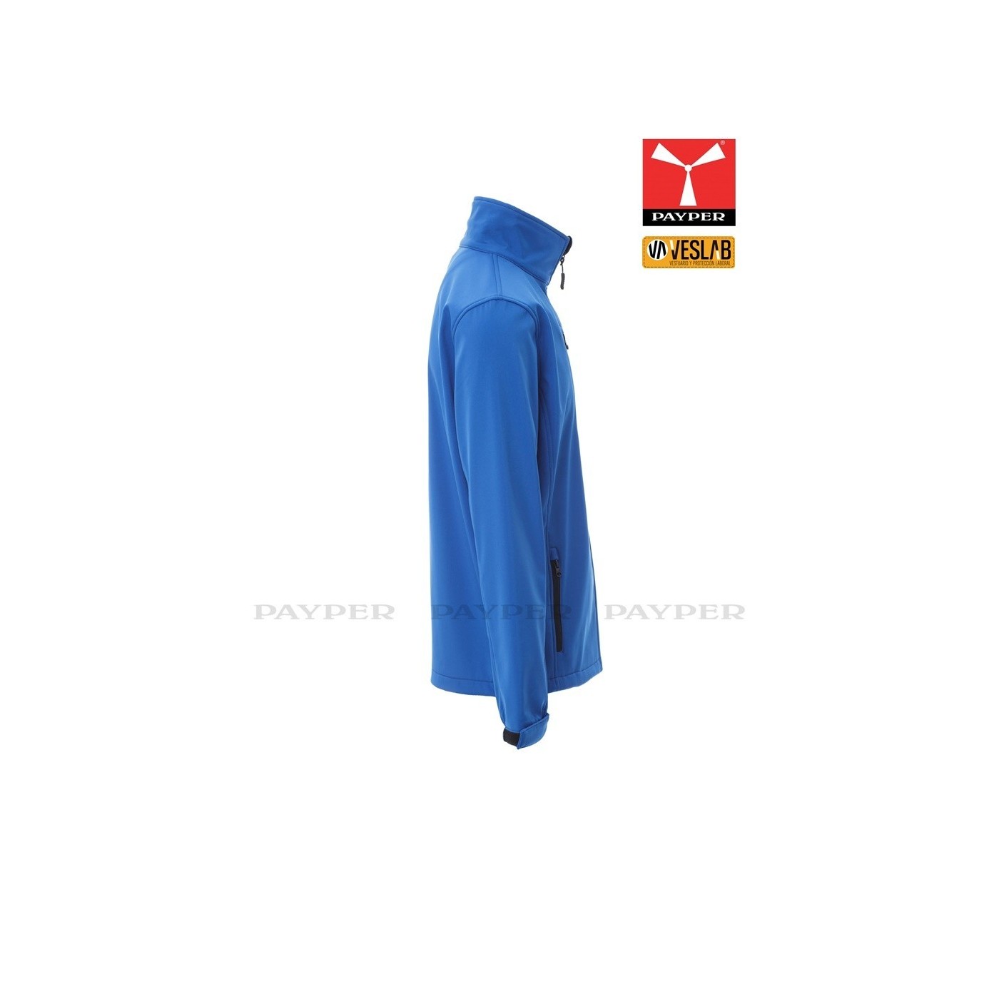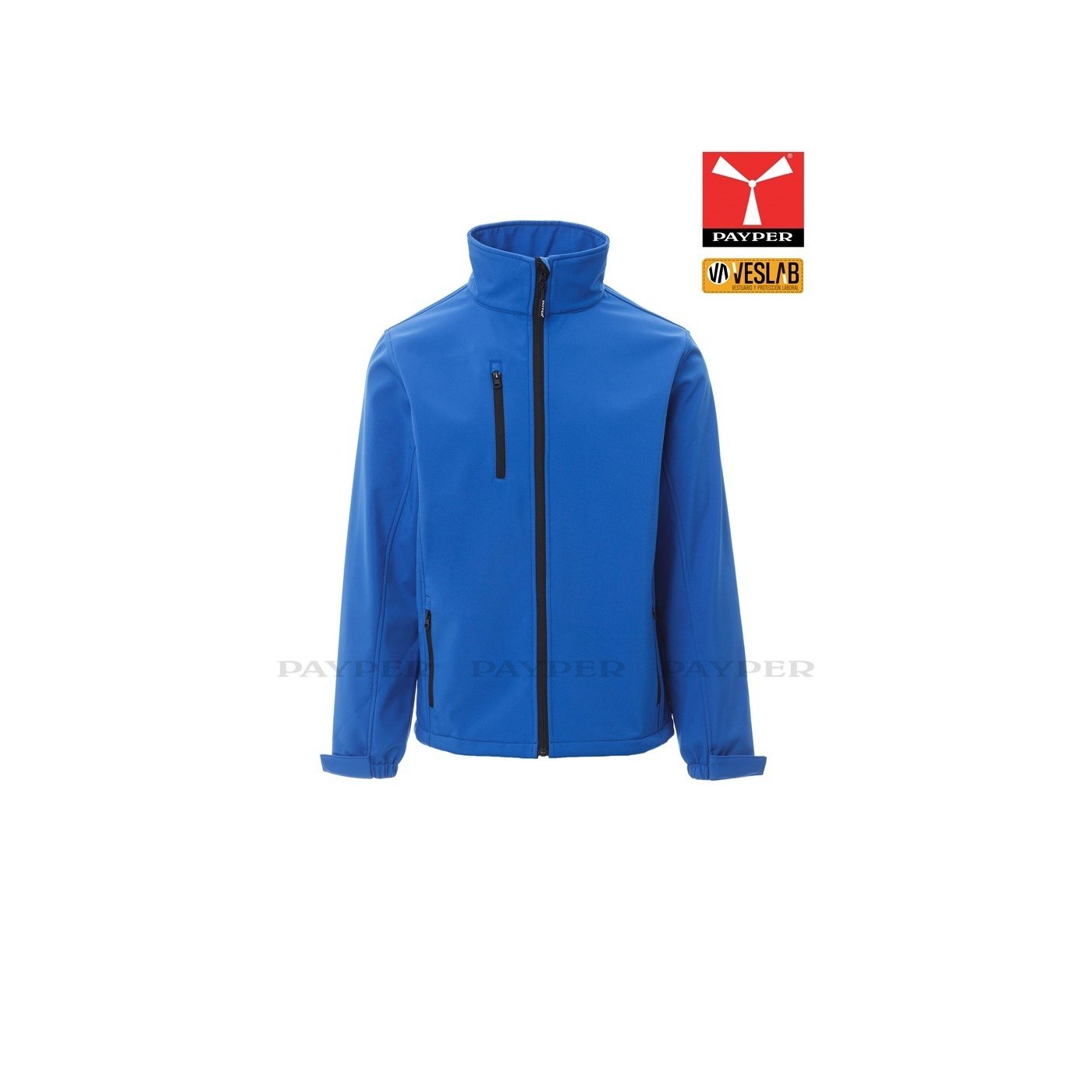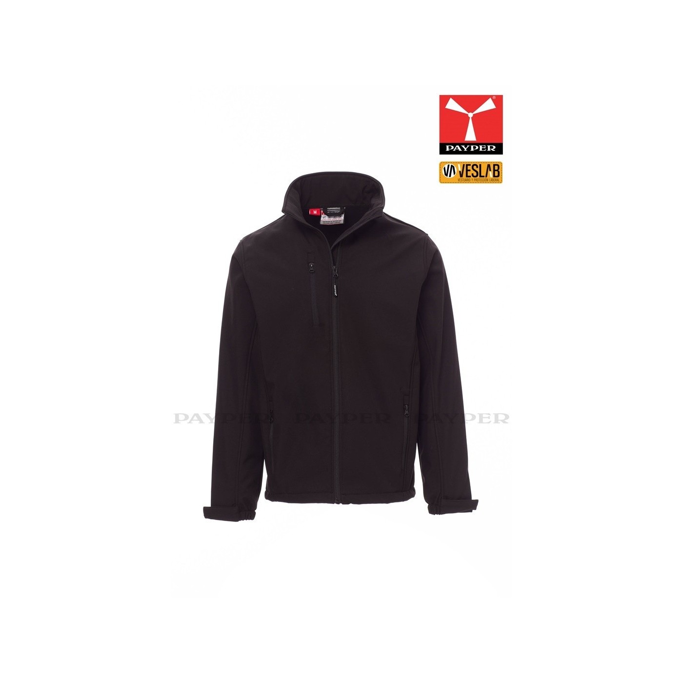 Ergonomic soft-shell jacket for men with full zip with tape. Elastic and adjustable velcro cuffs, two outer zippered pockets.