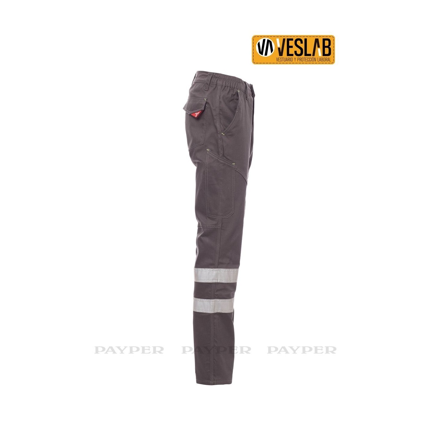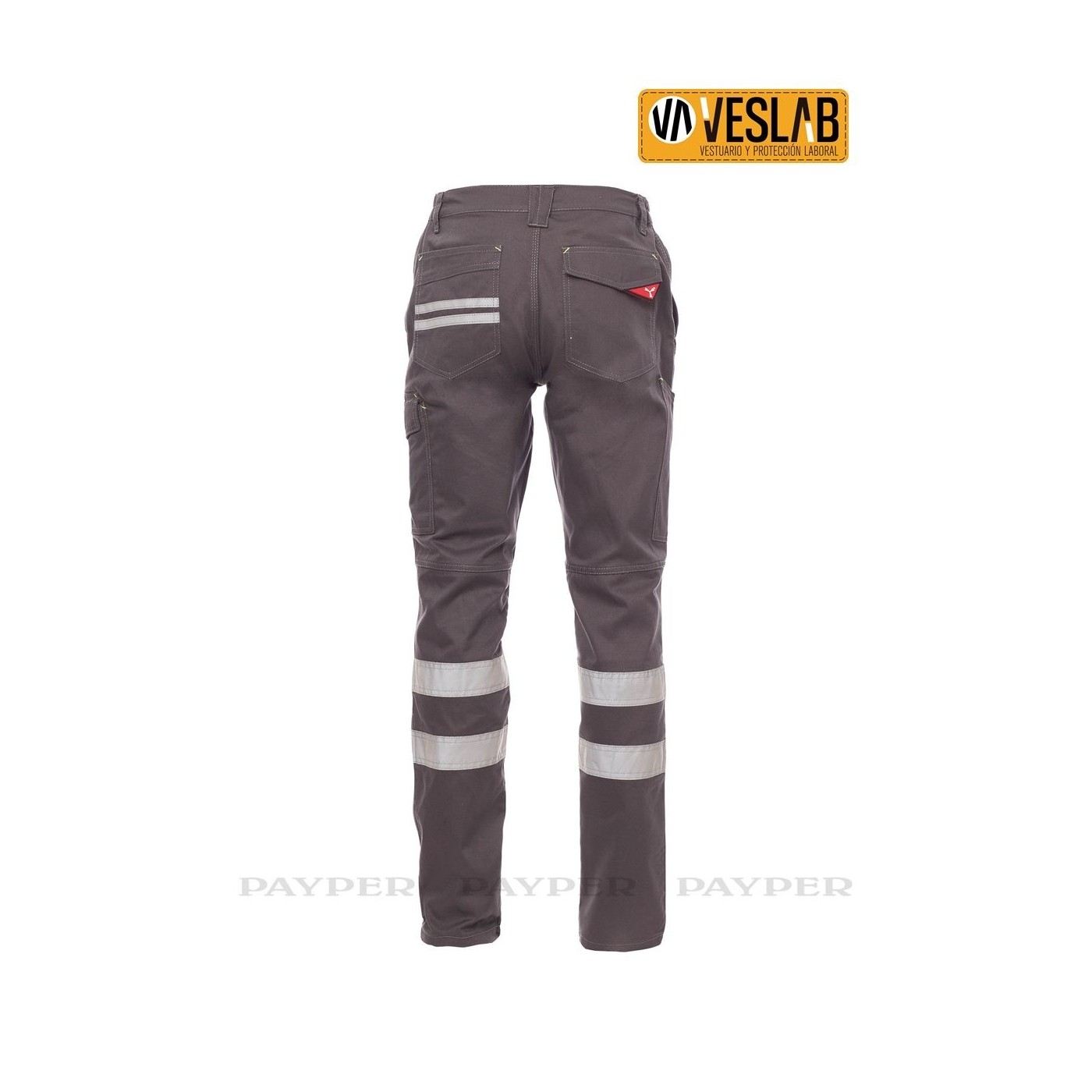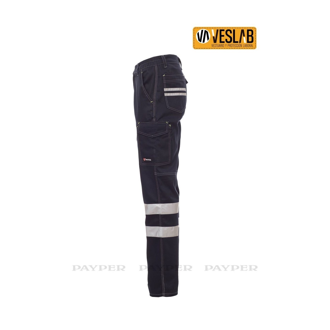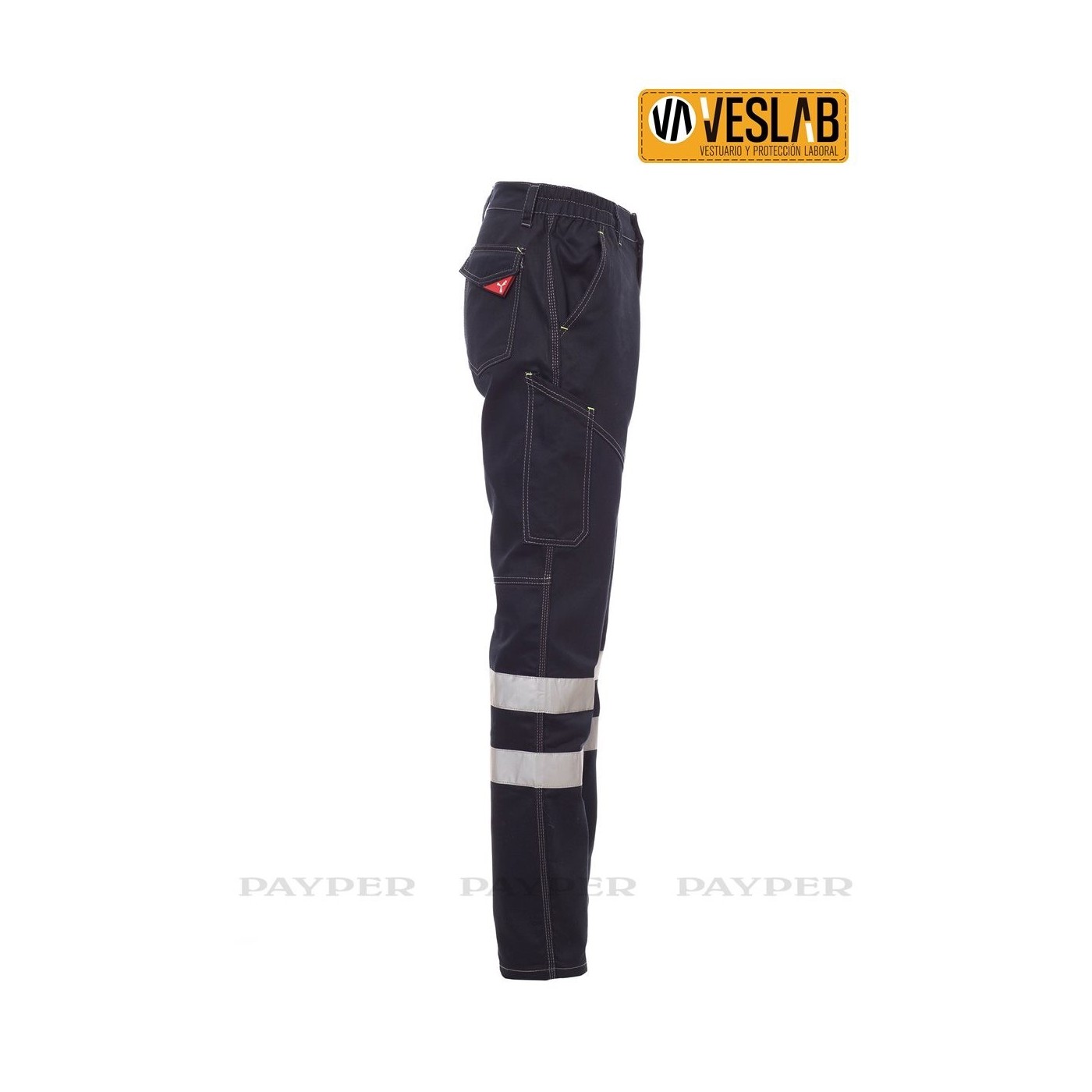 It has a zip and plastic button closure, two classic front pockets, a LOCK SYSTEM side pocket, a pocket for measuring tape, two back pockets, one open and one with flap and velcro, triple stitching on the crotch and on the side. inside leg.