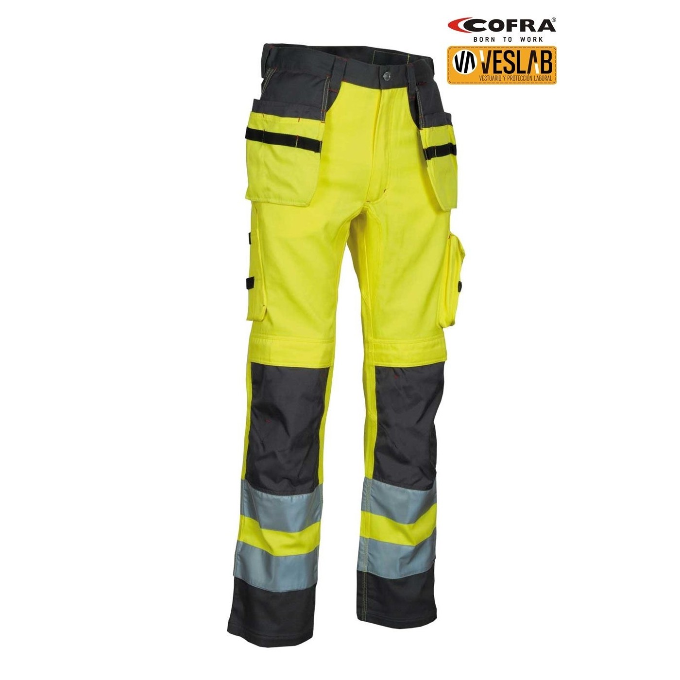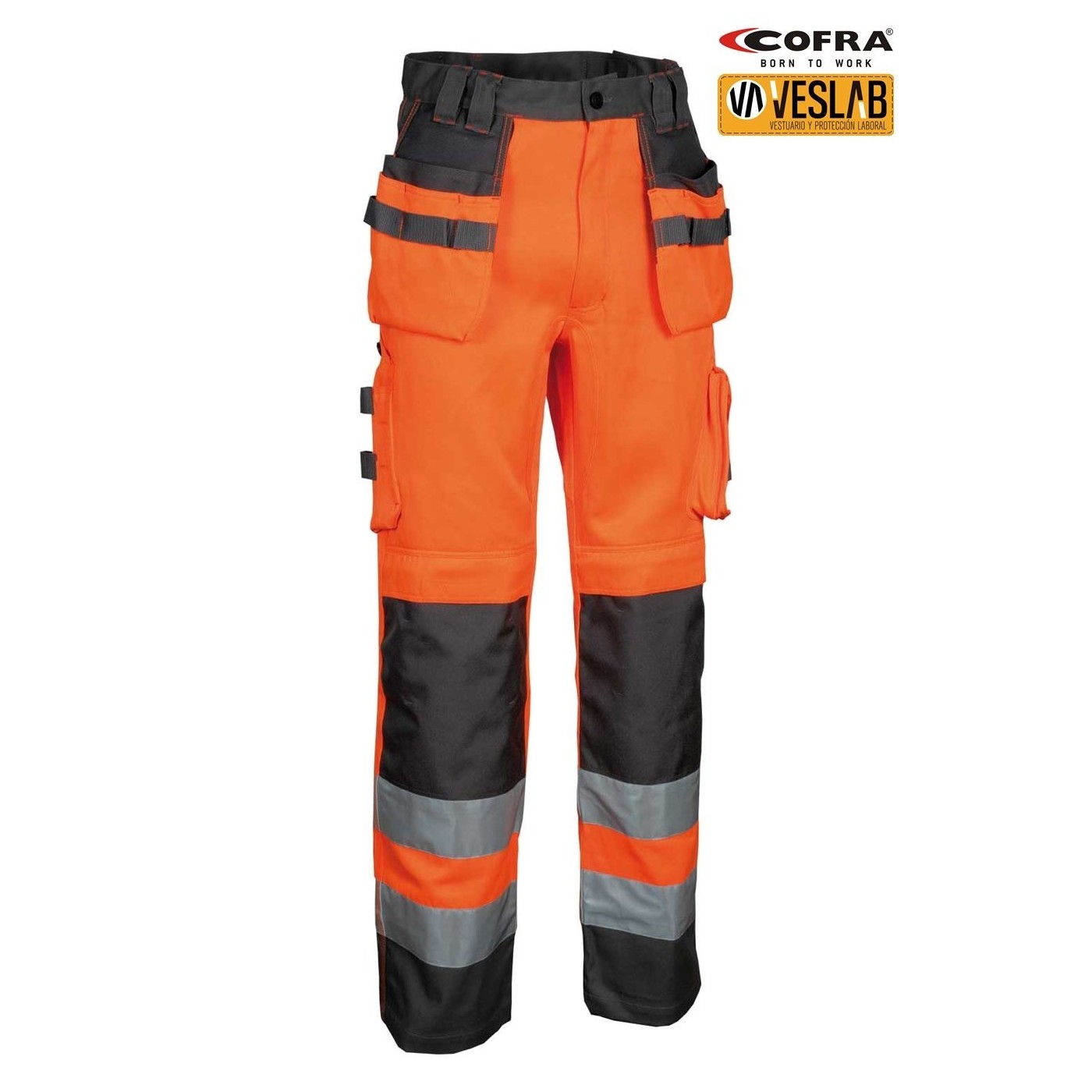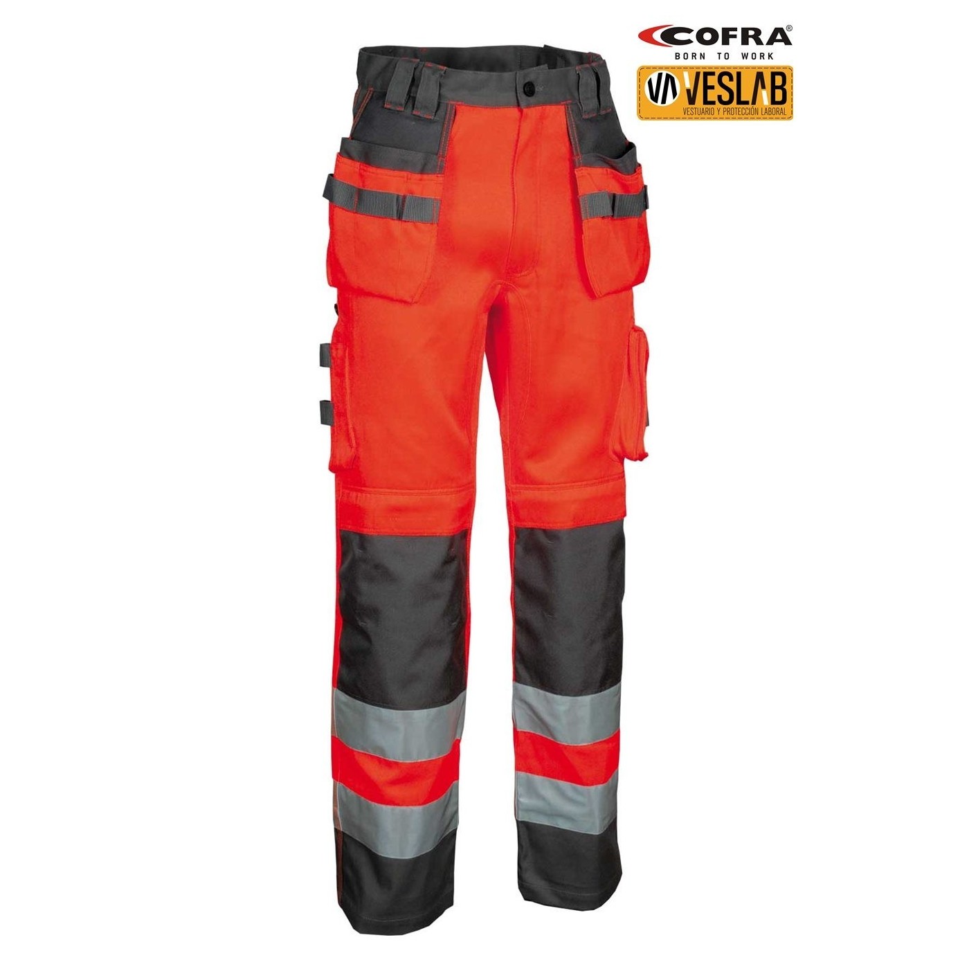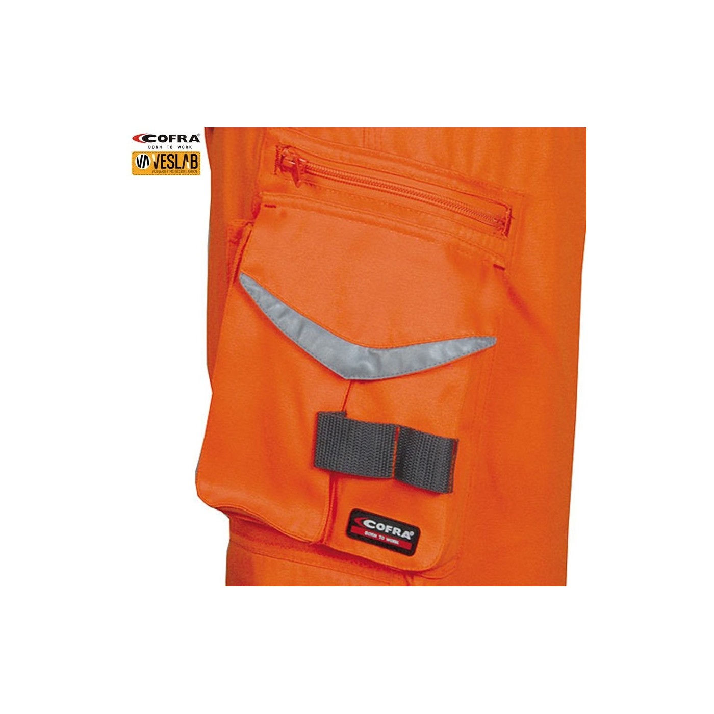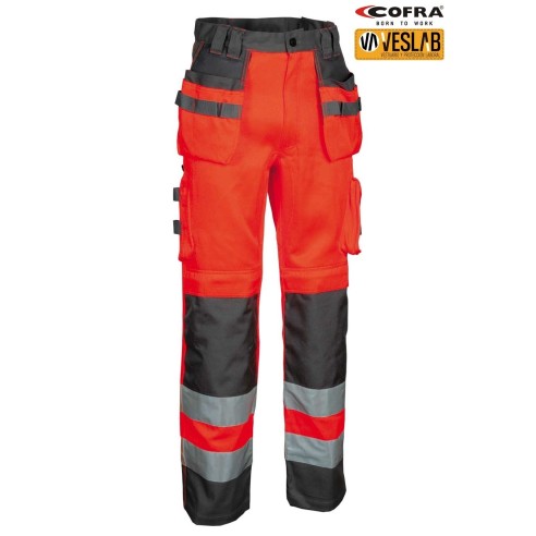 DESCRIPTION: ruler pocket, large front pockets, 3M ™ SCOTCHLITE ™ Reflective Material reflective strips and inserts - 9910 Silver Fabric, side pocket with tool holder inserts, left side pocket with zip closure, left side pocket with flap, pocket for knee pads in Position-adjustable CORDURA®, mobile pocket, exterior CORDURA® nail pockets, adjustable waist, ergonomic leg and knee cut, YKK® zip, double back pocket, one with flap, adjustable hammer pin, reinforced draft