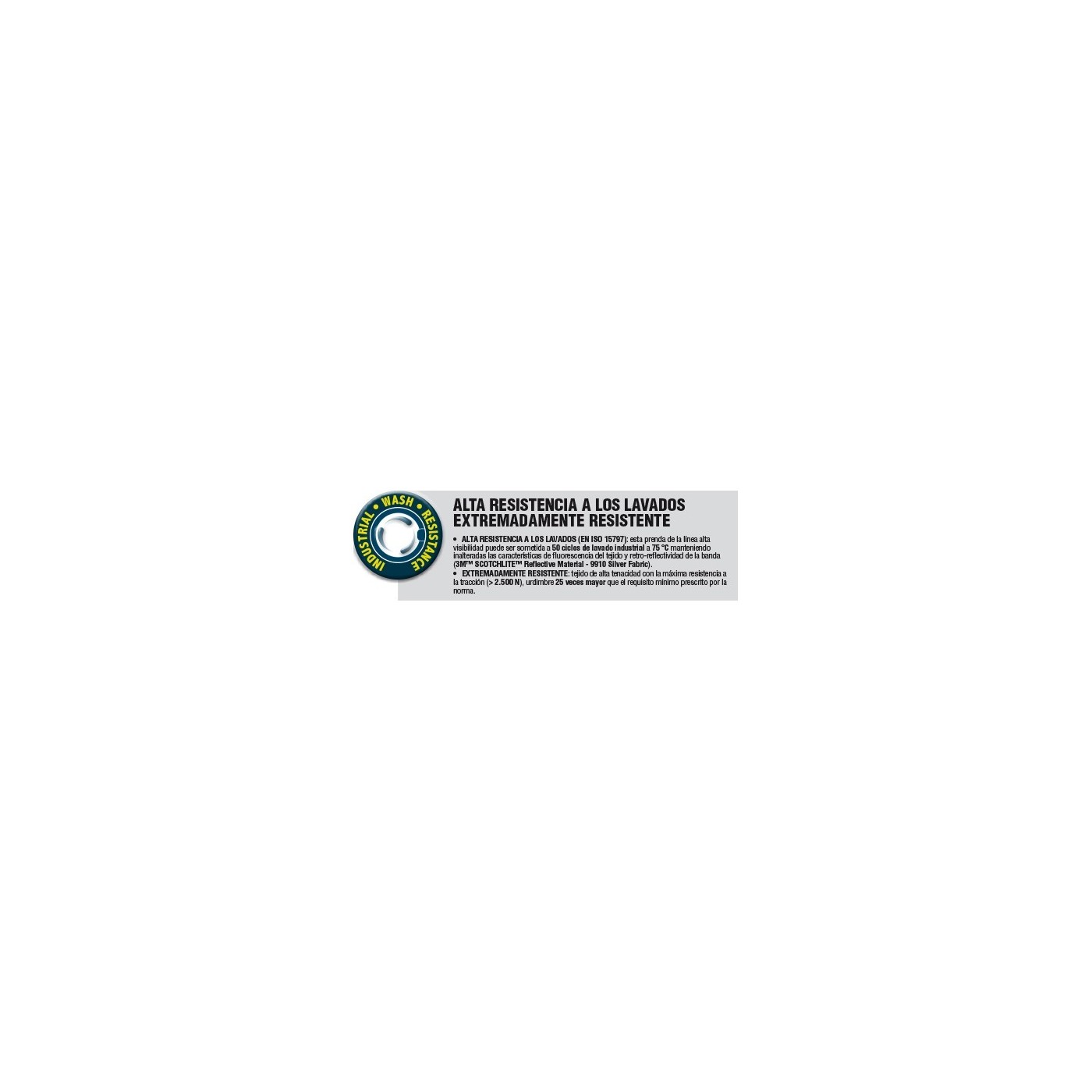 It offers high resistance to washing, and can be subjected to 50 industrial washing cycles at 75ºC, keeping the fluorescence characteristics of the fabric and retro-reflectivity of the 3M SCOTCHLITE Reflective Material-99910 Silver Fabric band unchanged.