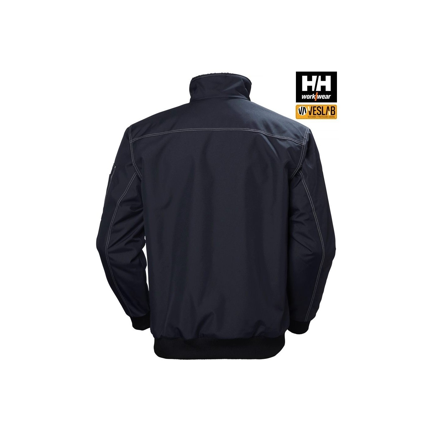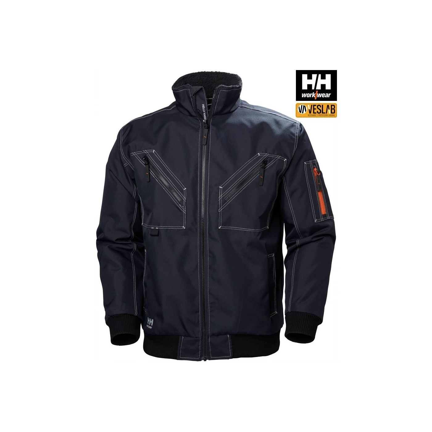 Helly Hansen workwear jacket with two pockets on the chest and one on the sleeve with zippers.