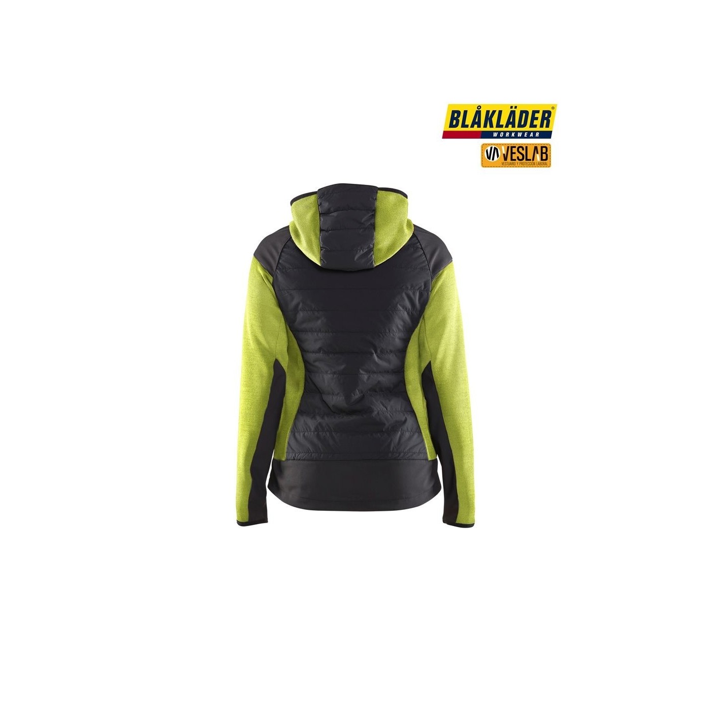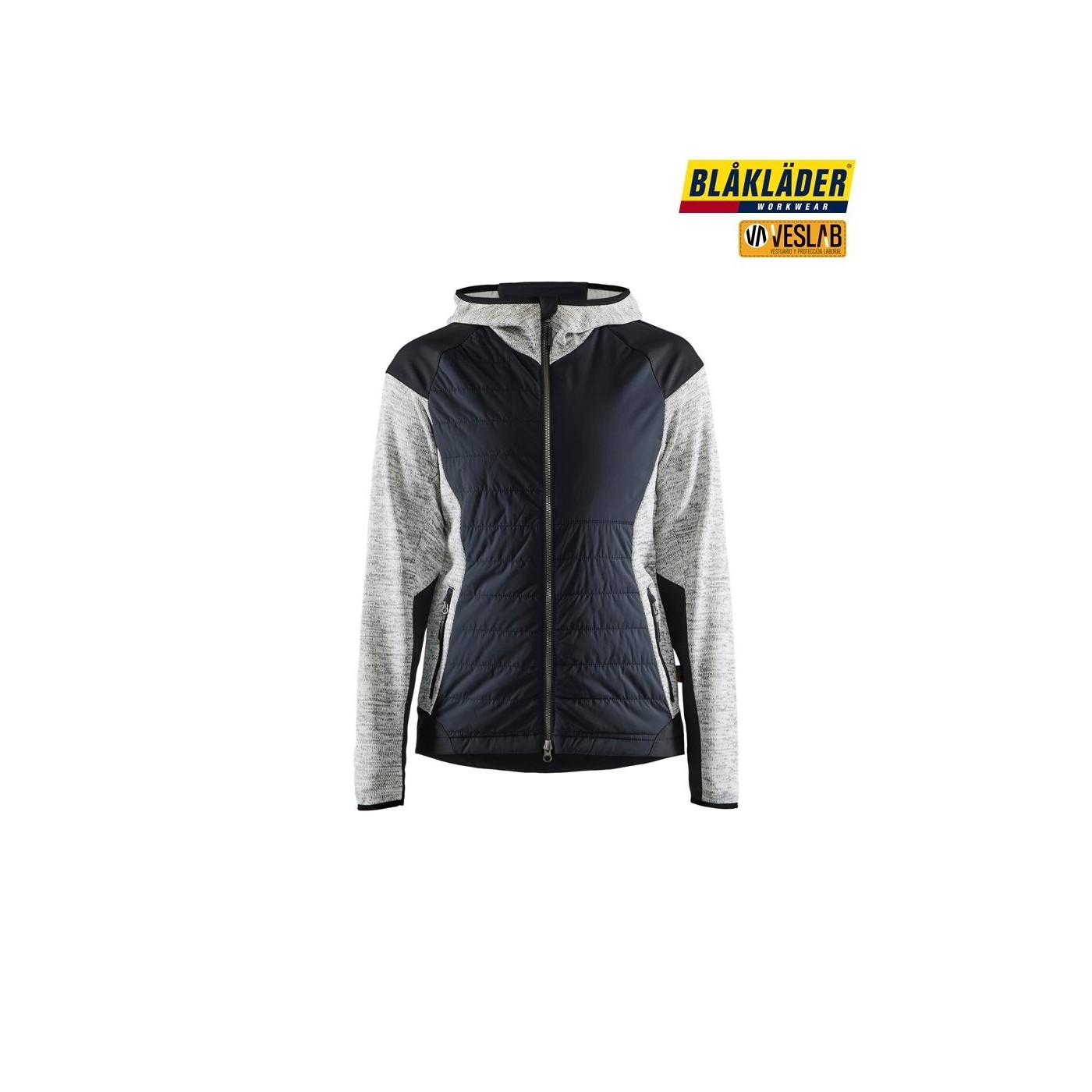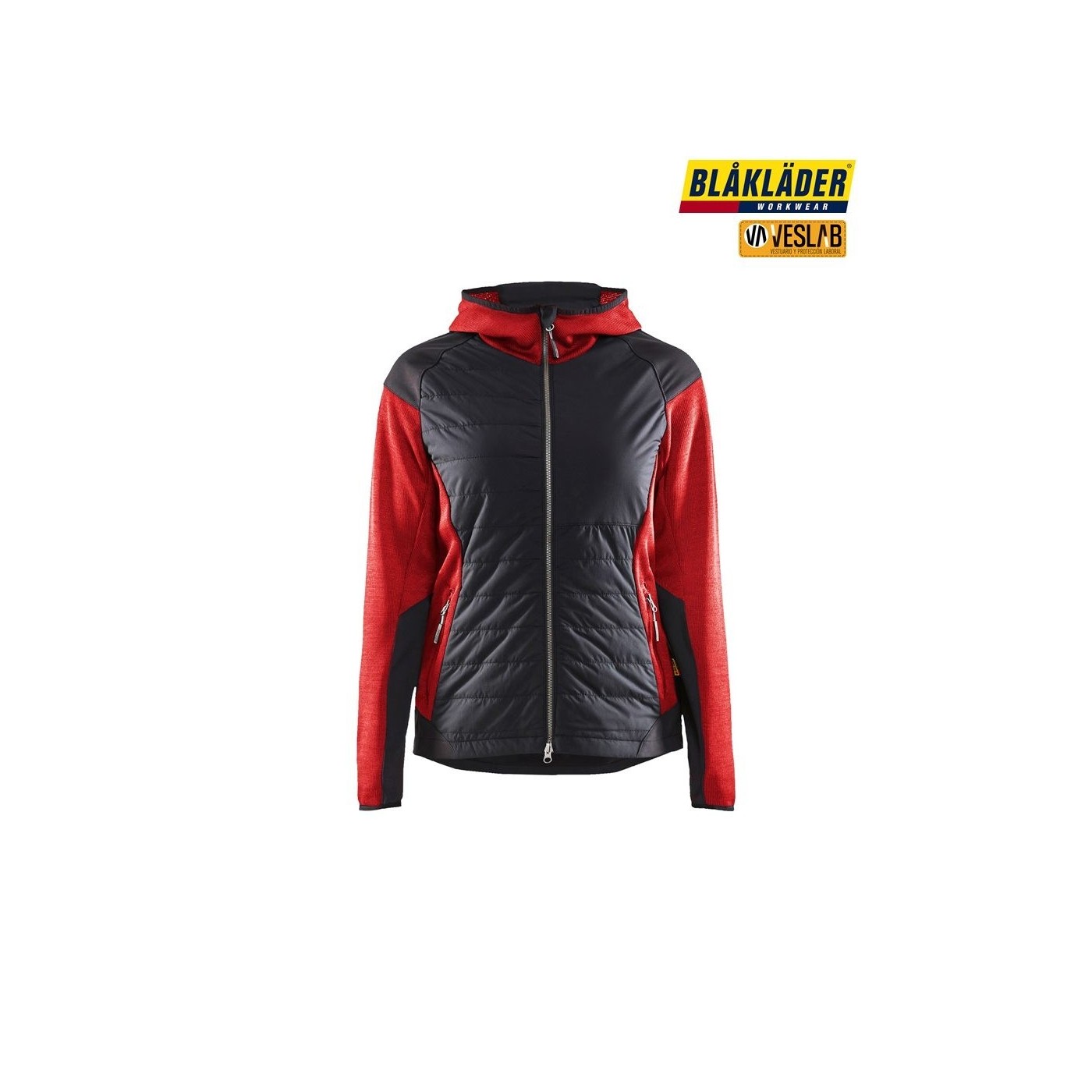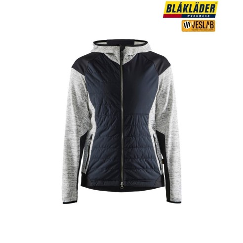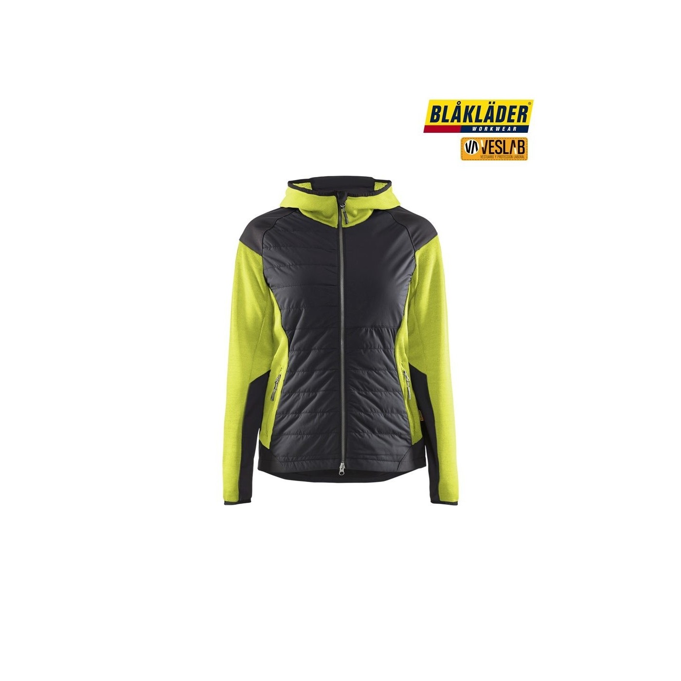 A hybrid woman jacket featuring a thin but warm padding on the front, back and hood, and soft shell fabric over the shoulders, arms and sides. A comfortable, warm garment that allows excellent freedom of movement when working in colder environments. Works equally well as a jacket or sweater.