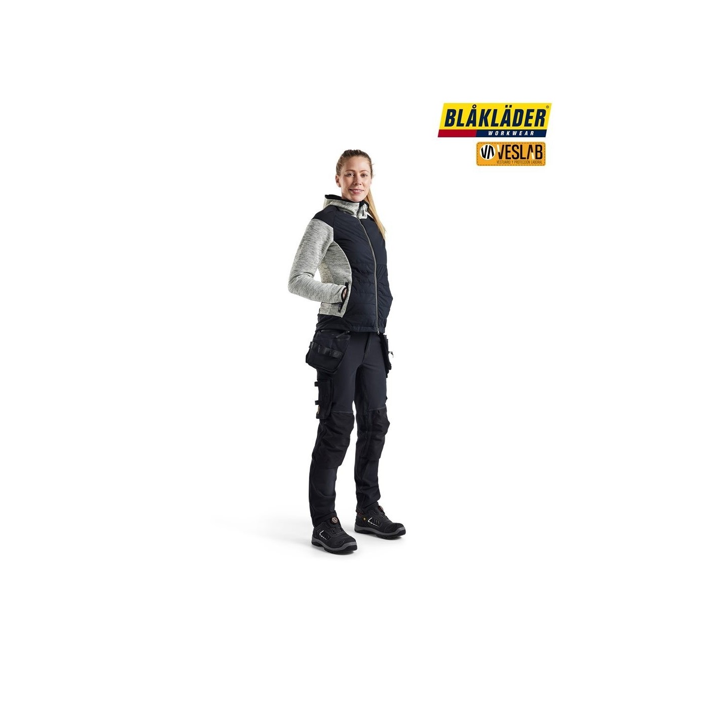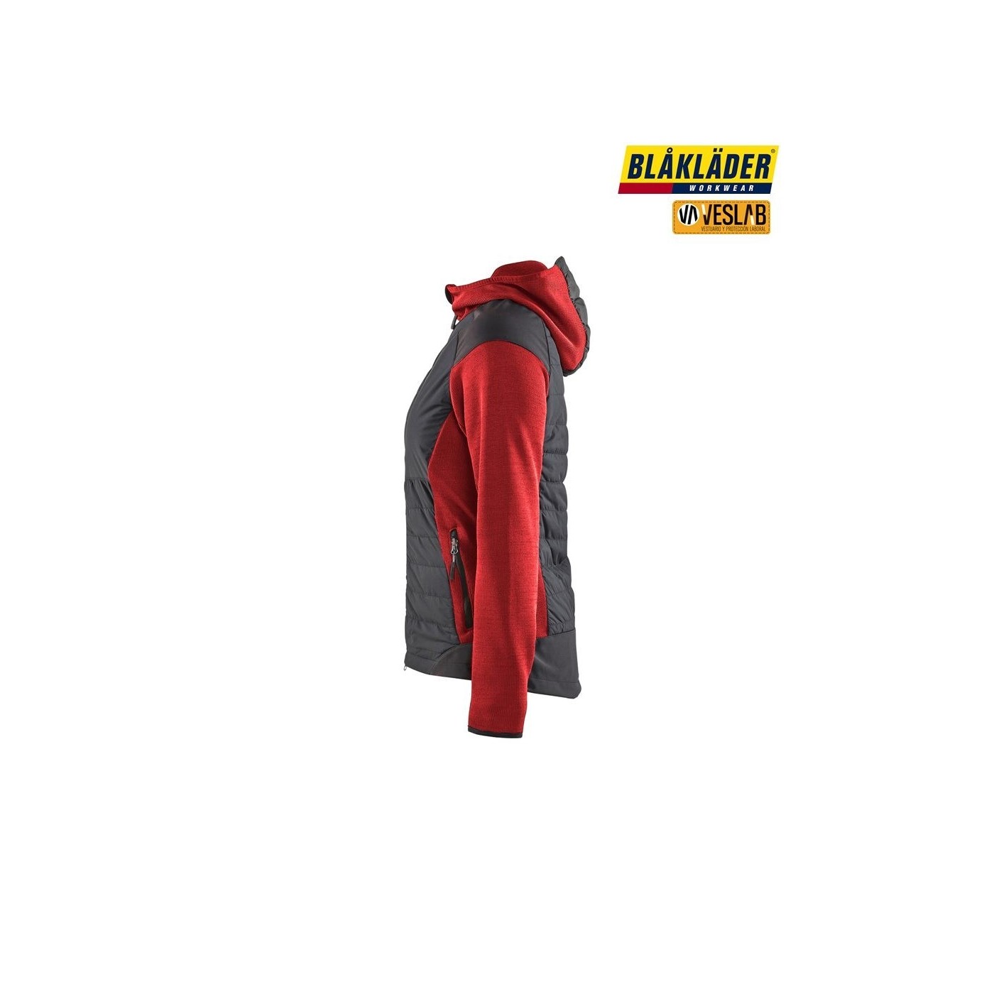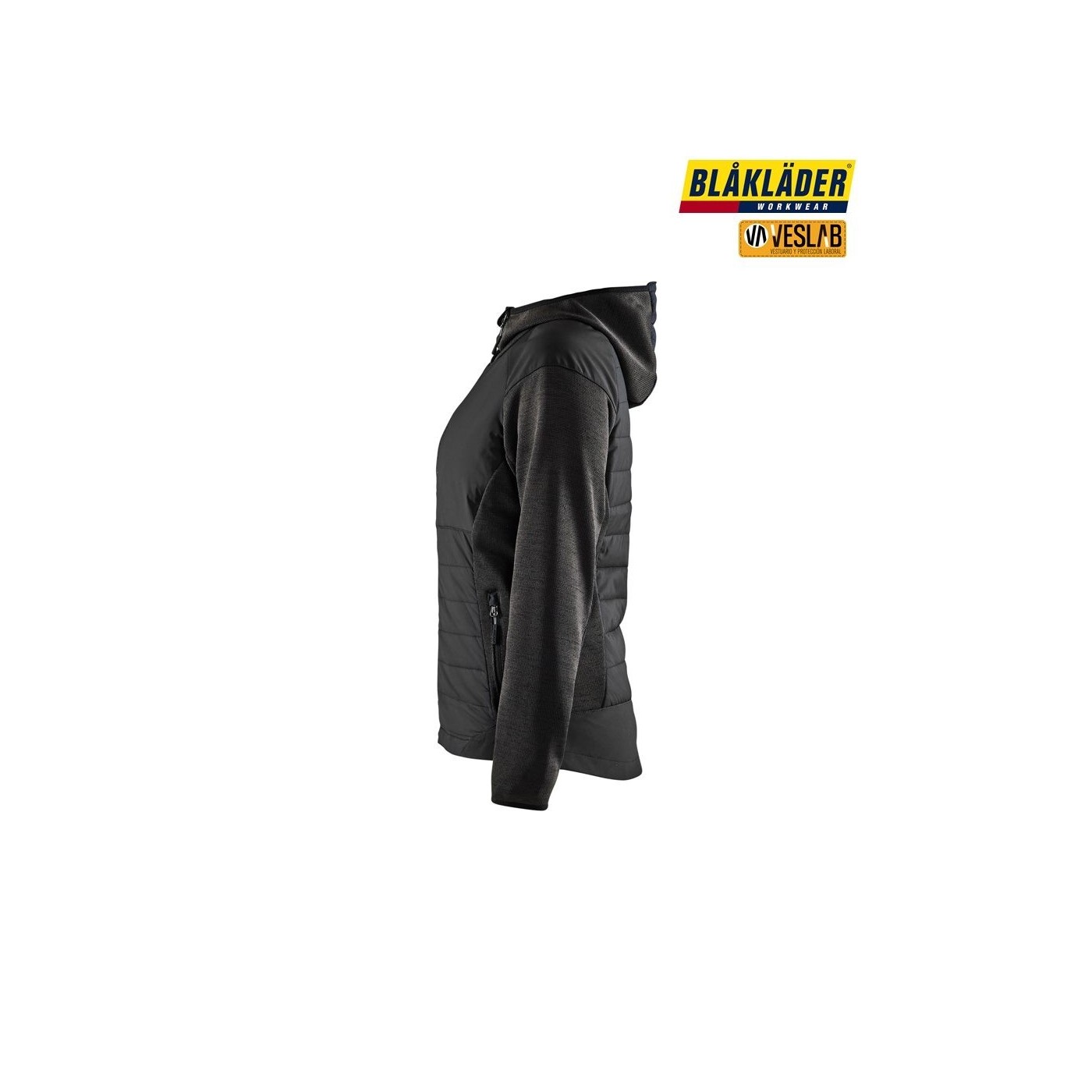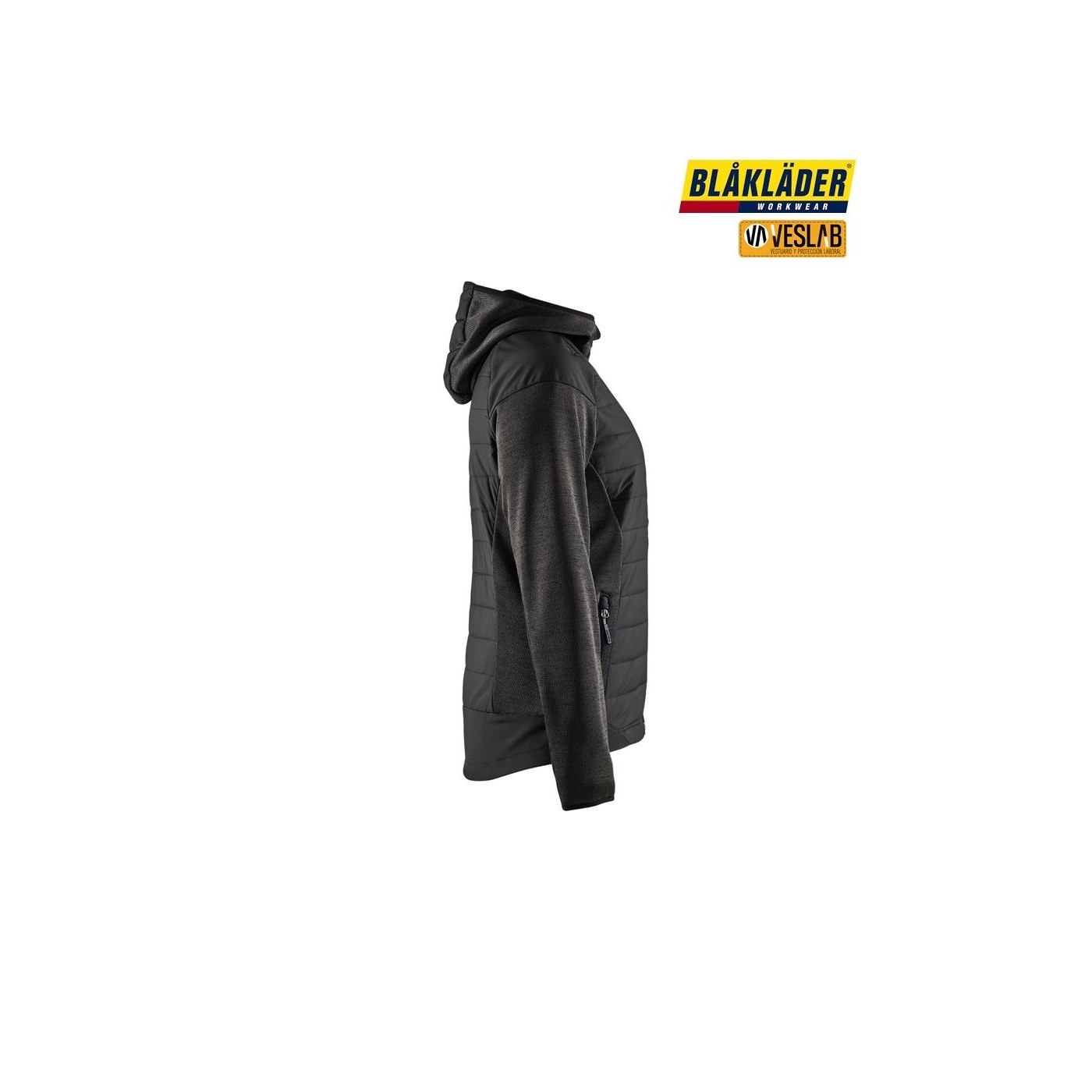 A hybrid woman jacket featuring a thin but warm padding on the front, back and hood, and soft shell fabric over the shoulders, arms and sides. A comfortable, warm garment that allows excellent freedom of movement when working in colder environments. Works equally well as a jacket or sweater.