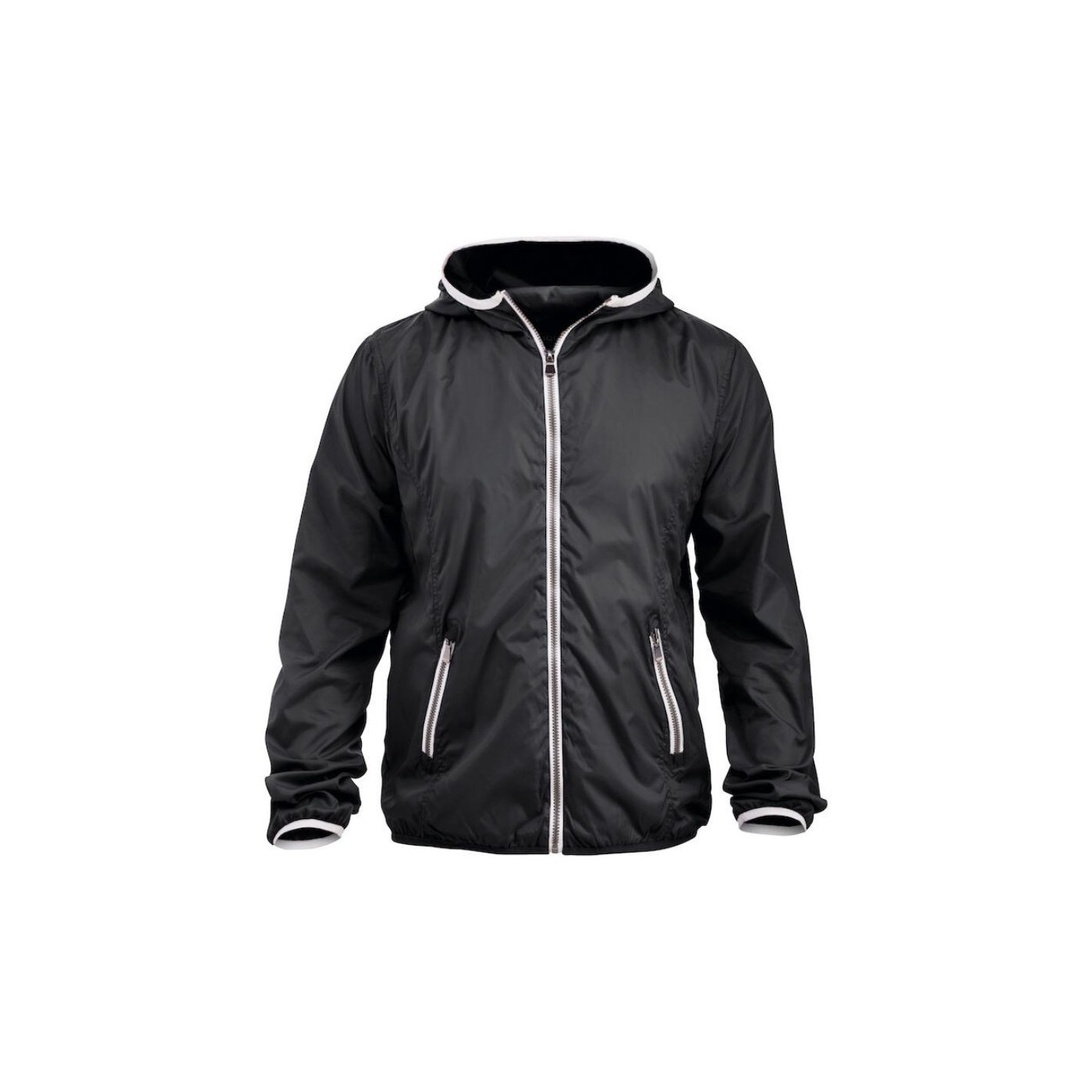 For those looking for a modern Windbreaker at the best price. Equipped with hood and decorative metal zippers. Inner lining. Contrast placket around hood and sleeves with elastic fitted cuffs.