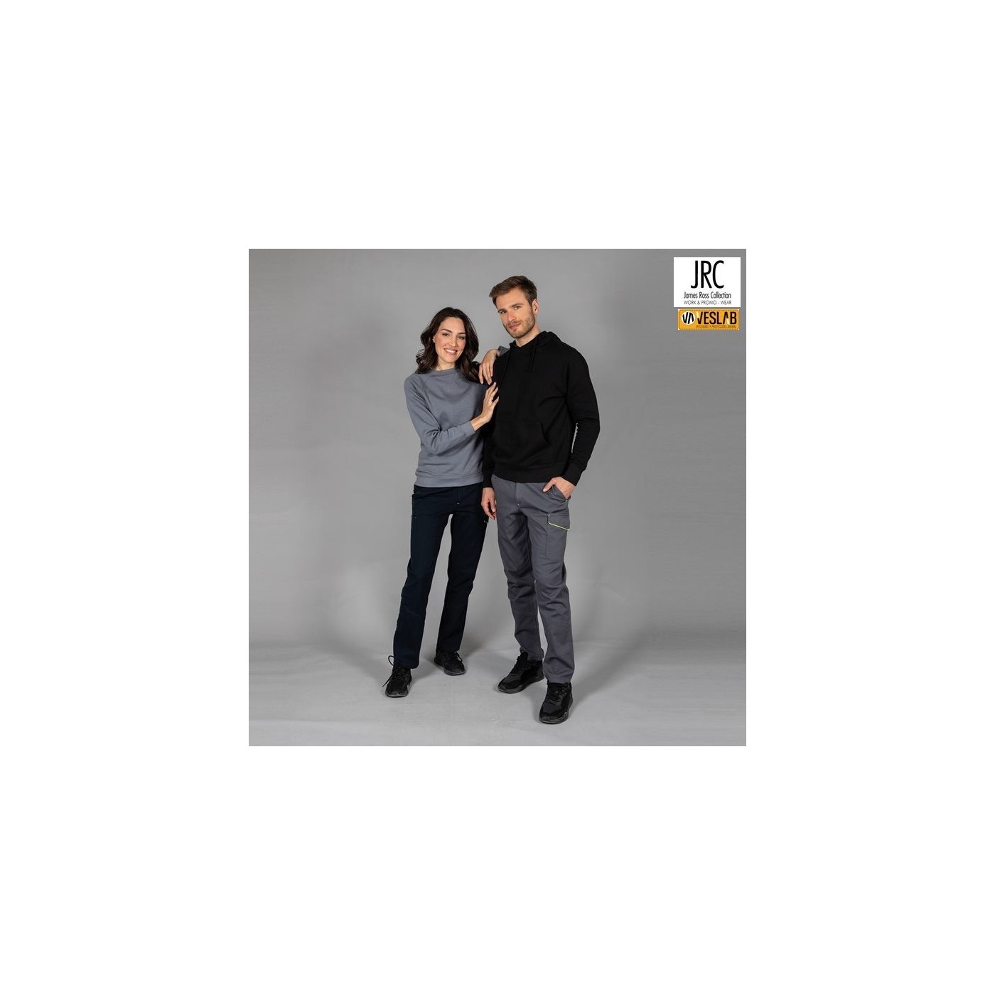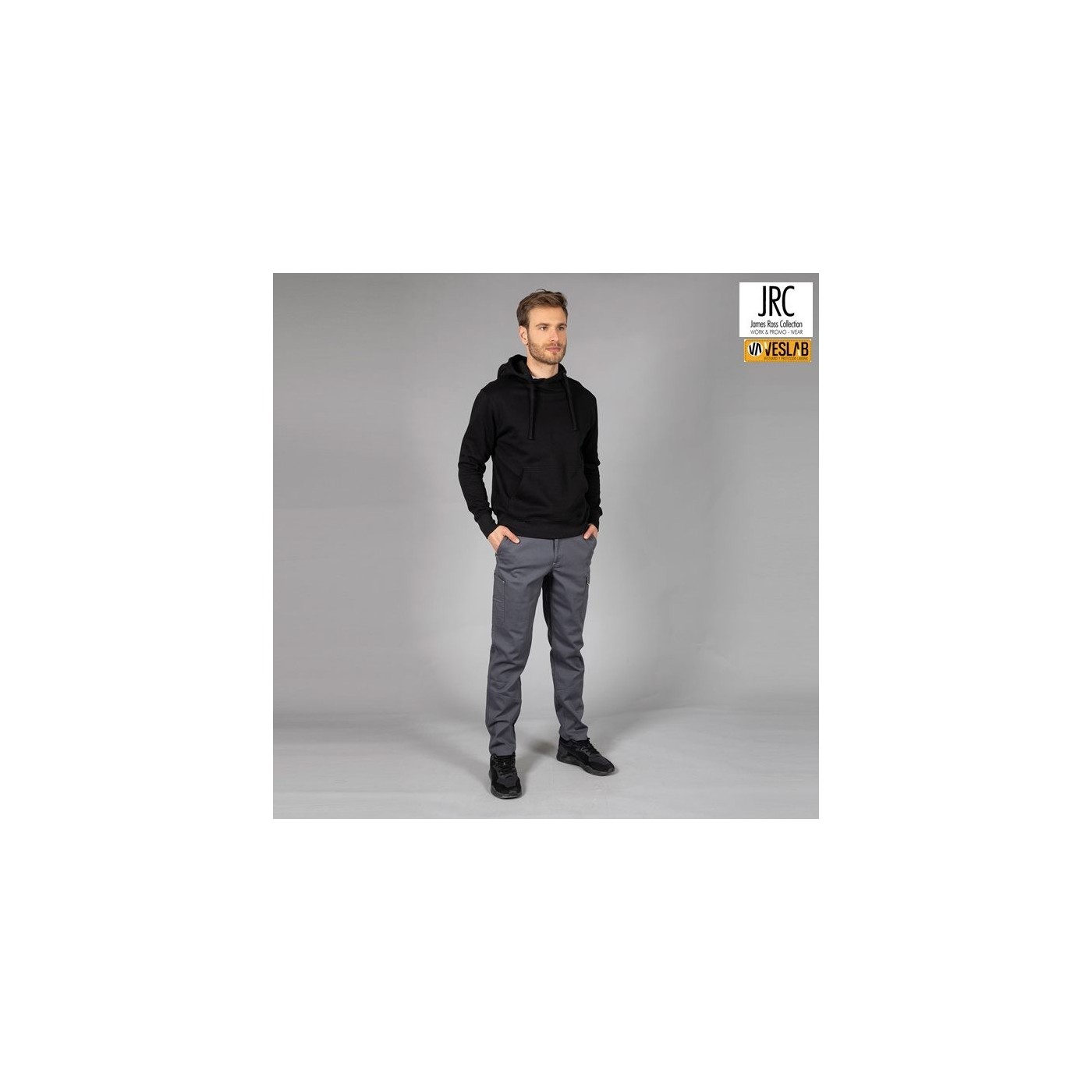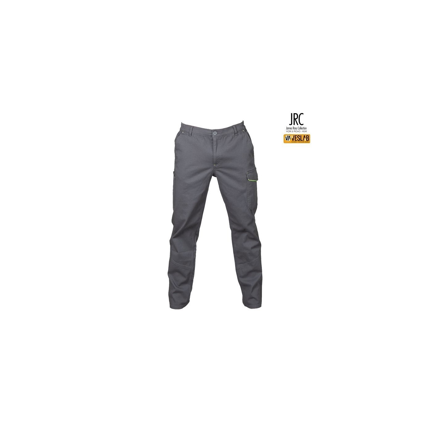 Multi-pocket work trousers made of pre-washed elastic fabric with a composition of 98% cotton - 2% elastane. It has two front pockets, a side pocket with velcro, a double pocket for ruler and tool holder with fluo yellow trim and a back pocket with velcro.
