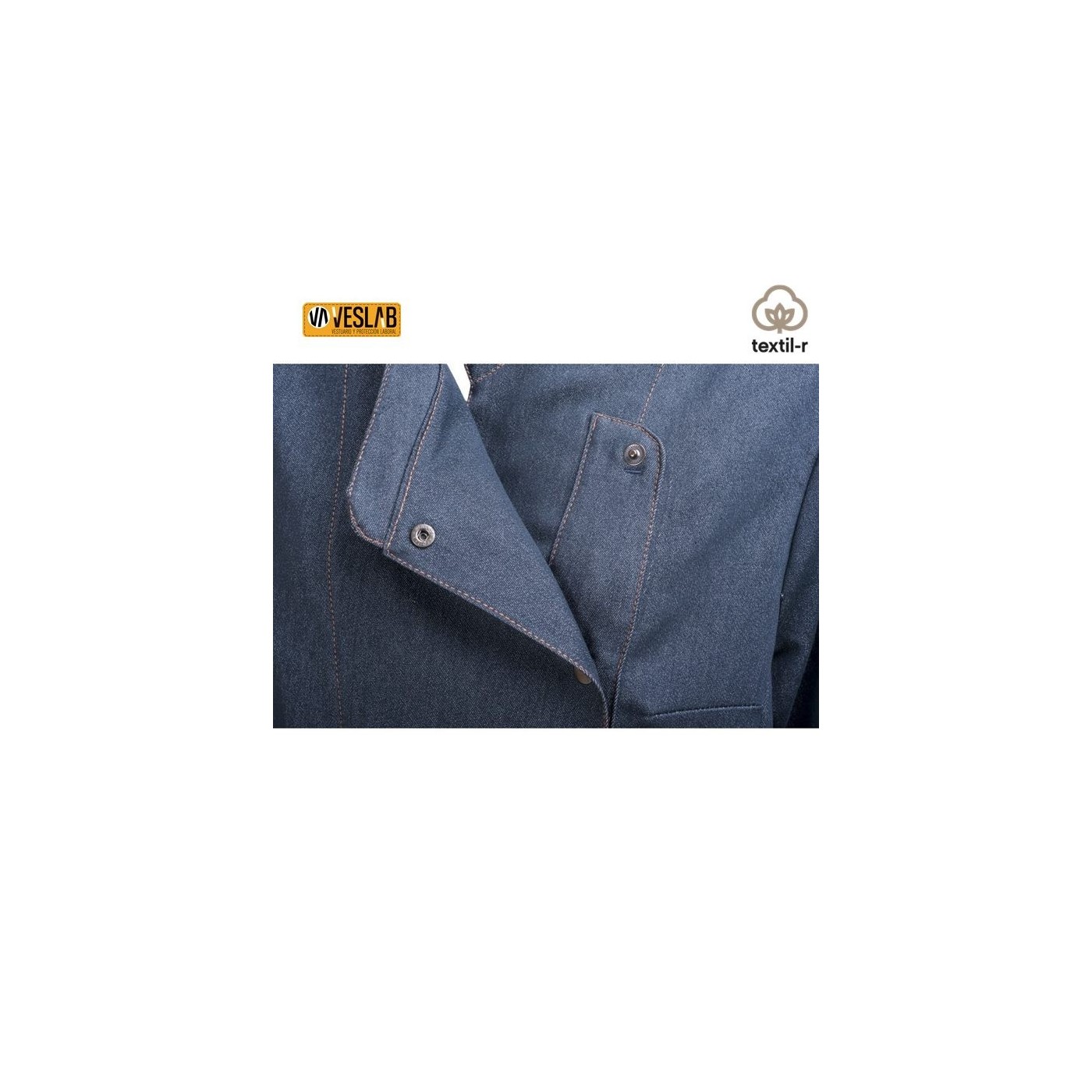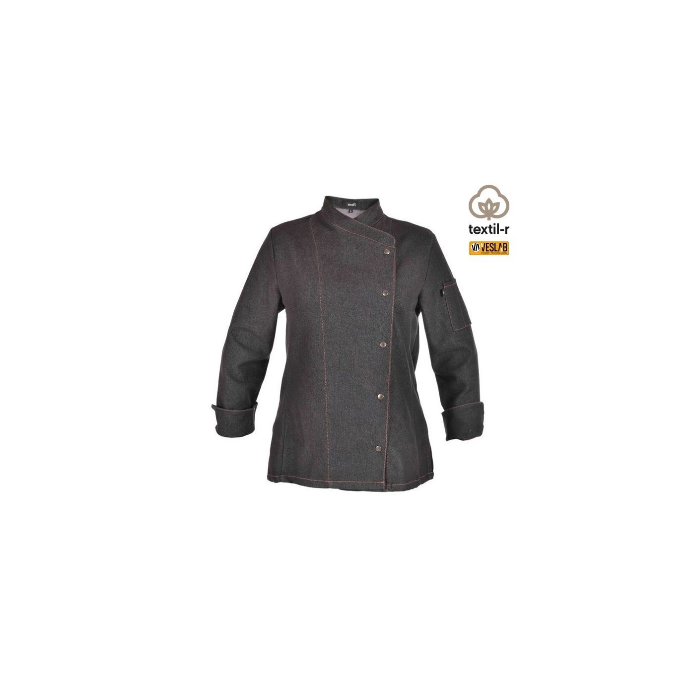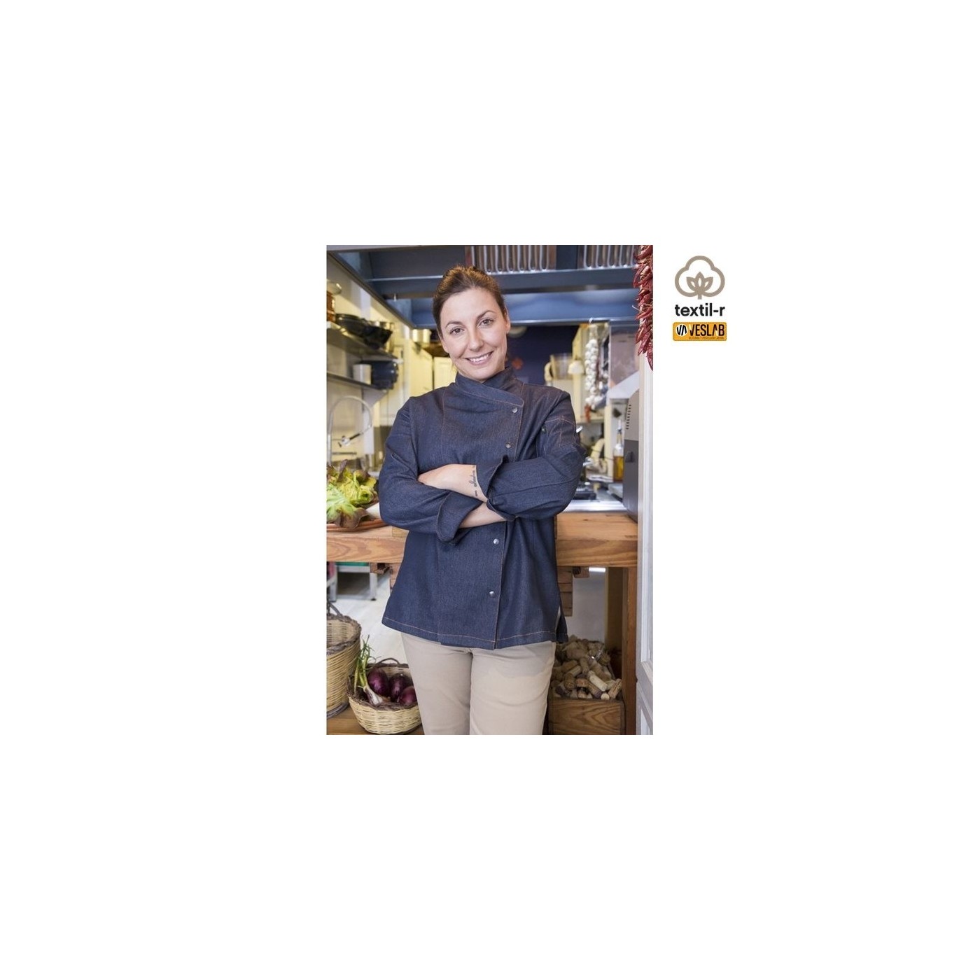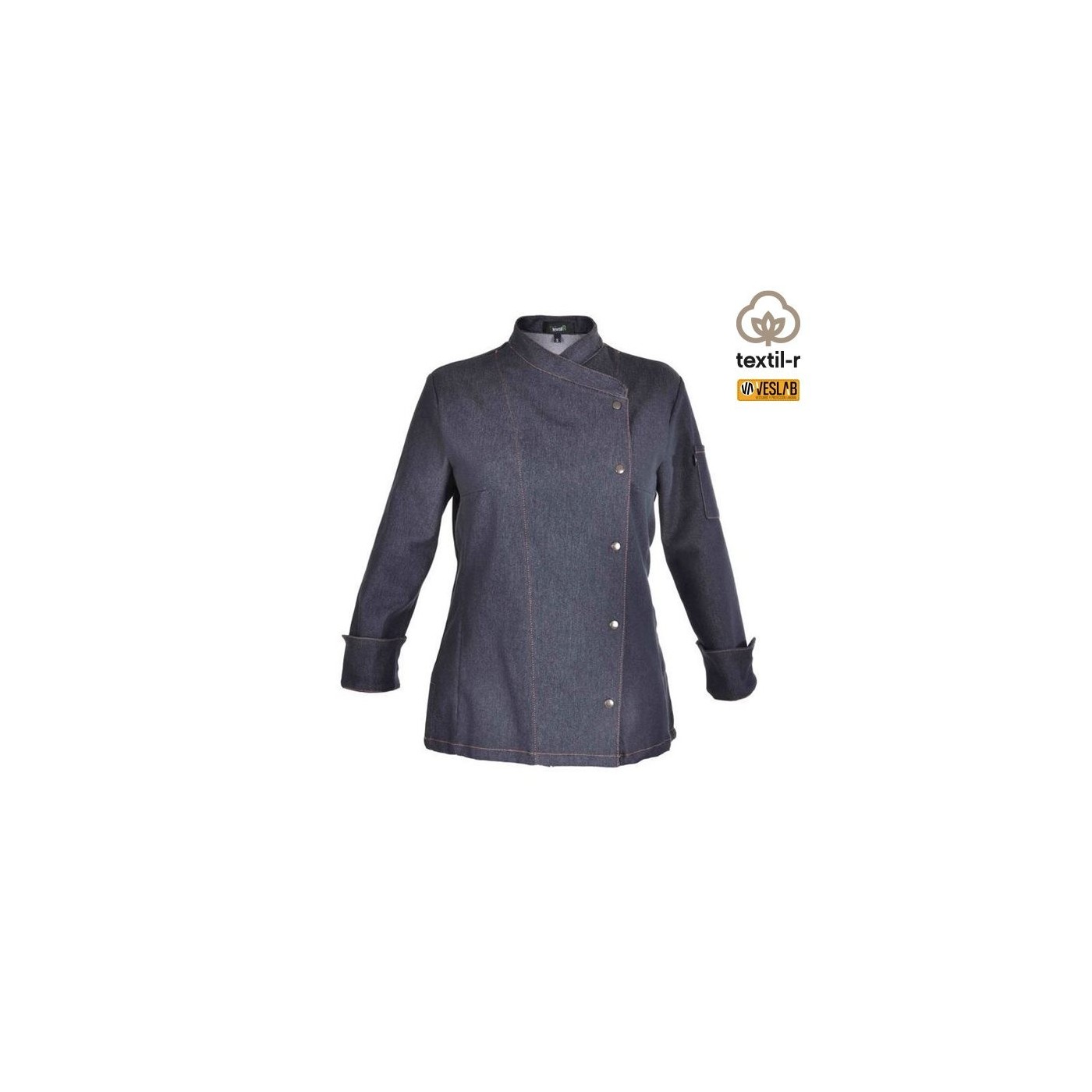 Kitchen jacket for women in denim fabric with long sleeves. Hook-and-eye closure.