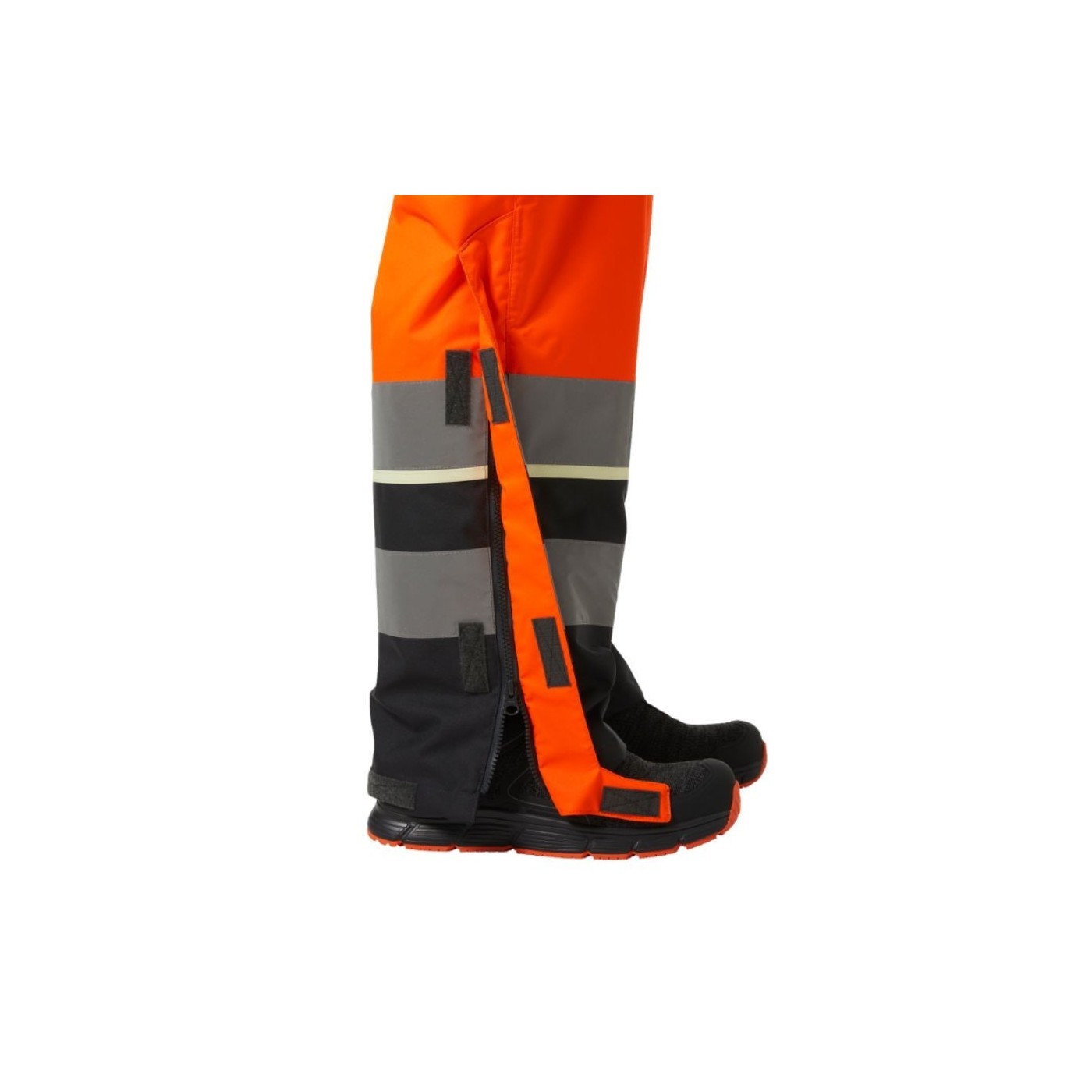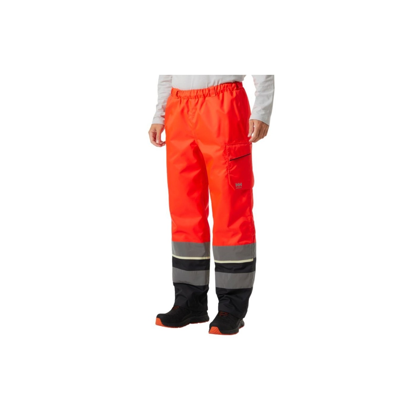 Winter high visibility class 2 UC-ME pants from Helly Hansen, designed with UC-ME technology to enhance visibility in low light conditions. They feature an elastic waistband, thigh pocket, knee-length zipper, and Vizlite photoluminescent strips that charge in 10 minutes and provide up to 8 hours of autonomy. Ideal for activities in dark environments.