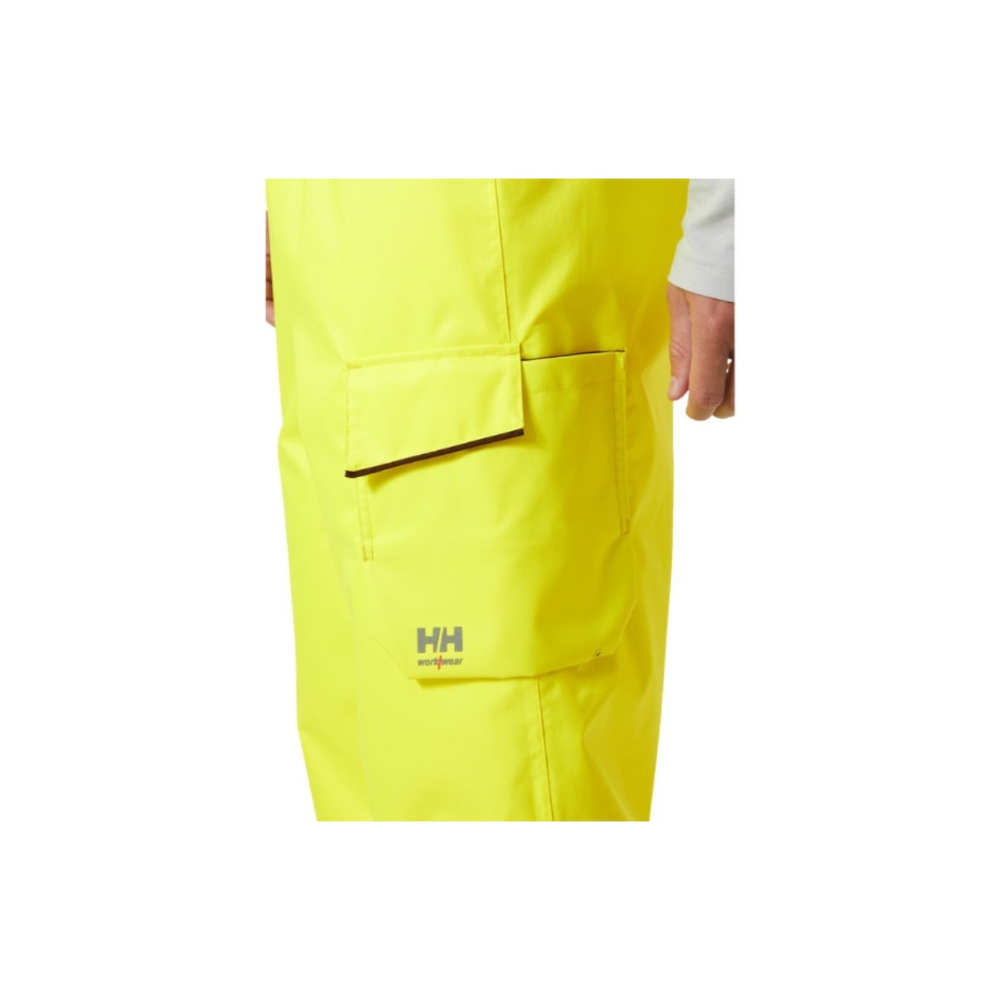 Winter high visibility class 2 UC-ME pants from Helly Hansen, designed with UC-ME technology to enhance visibility in low light conditions. They feature an elastic waistband, thigh pocket, knee-length zipper, and Vizlite photoluminescent strips that charge in 10 minutes and provide up to 8 hours of autonomy. Ideal for activities in dark environments.
