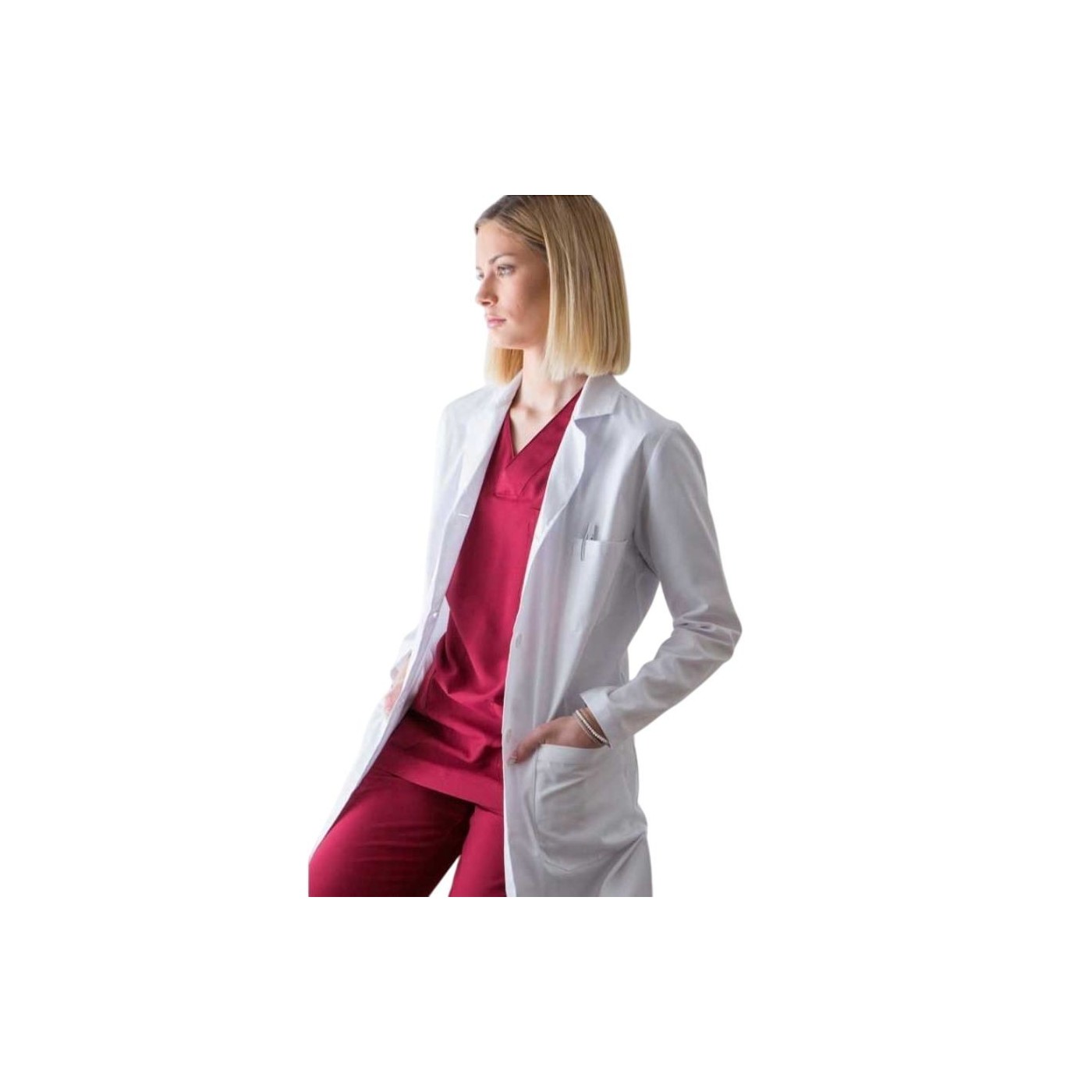 Beyond functionality, this coat projects a clean, professional, well-kept appearance, essential in public-facing and healthcare roles. Its feminine cut and lightweight structure maintain an orderly, modern look, contributing to a better perception of the team.