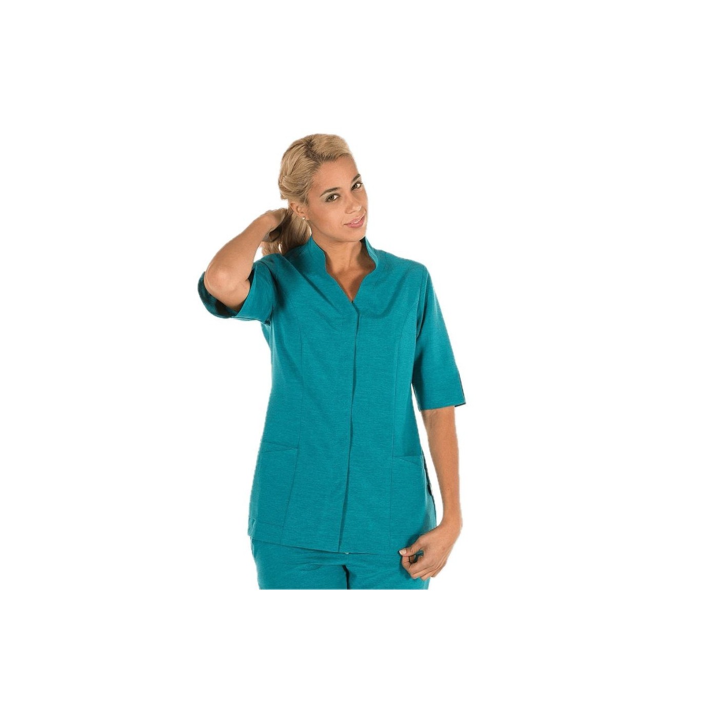 Women's short-sleeved jacket with slits, mandarin collar, hidden press-stud fastening and two pockets between the sides. Semi-fitted garment, with selvages on the front and back. Made of 100% Polyester JASPER, a fabric that provides maximum comfort and resistance to peeling, with a soft touch and applied technology that prevents the passage of liquid and fluid splashes.