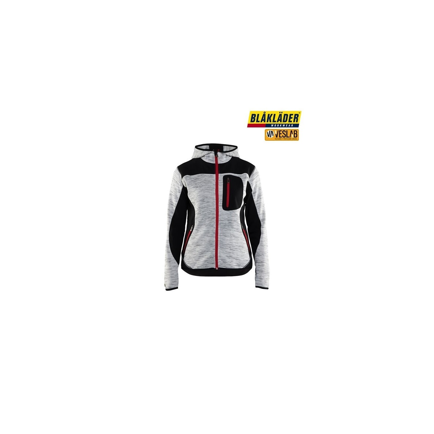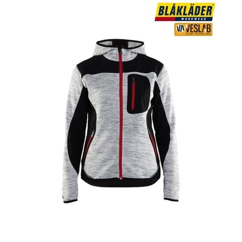Hooded cardigan for woman with a practical design for added comfort. The jacket has contrasting zippers and is reinforced with a softshell-like material at the elbows, shoulders and back to increase resistance to tears. It is an excellent jacket for both work and leisure time.