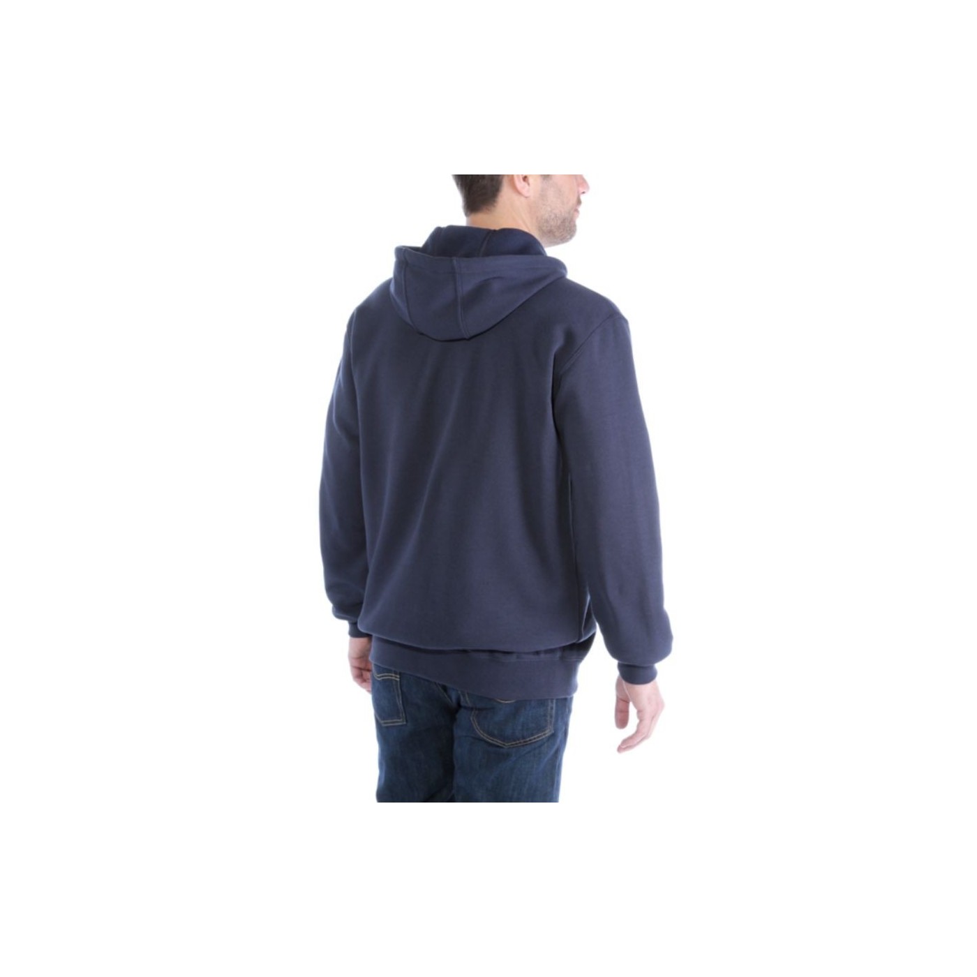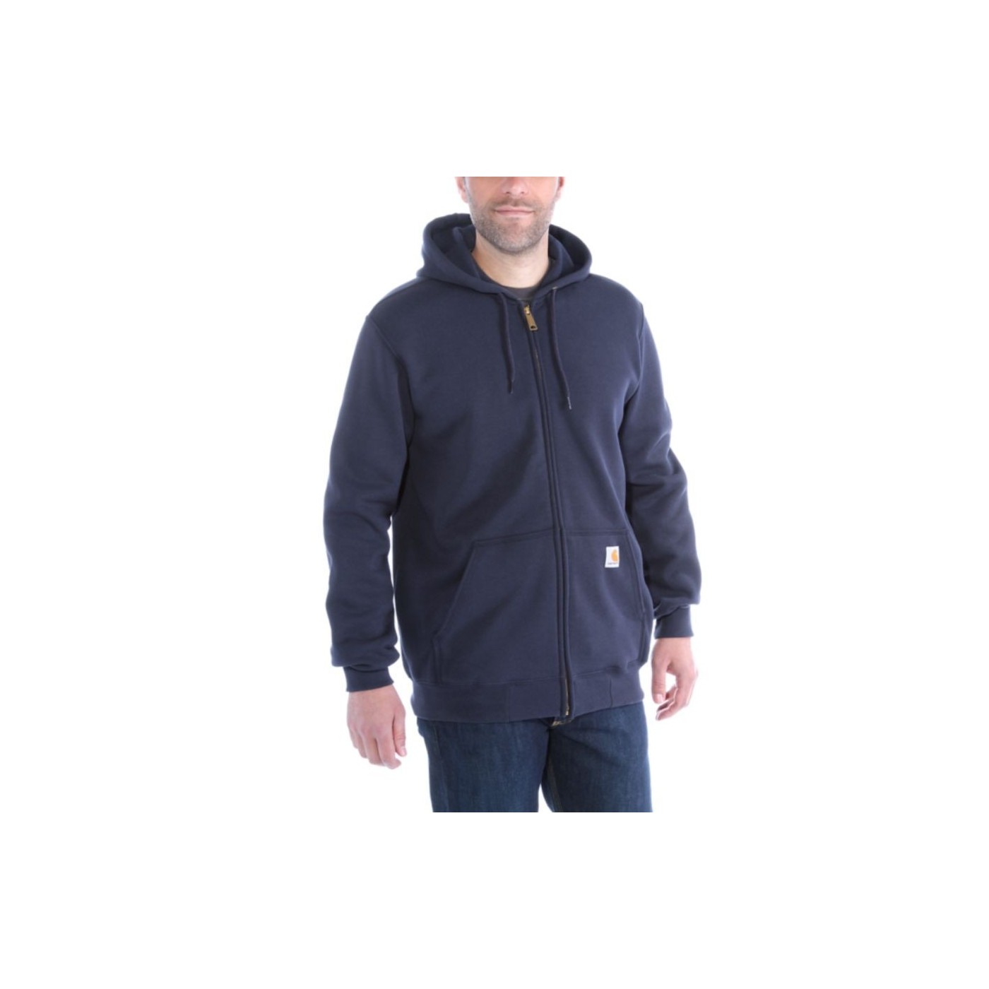 Carhartt men's loose-fit zip-up hoodie made of midweight fleece. It offers maximum comfort, freedom of movement, and durability for work or everyday use. It includes an adjustable hood, front pockets, and reinforced elastic cuffs.