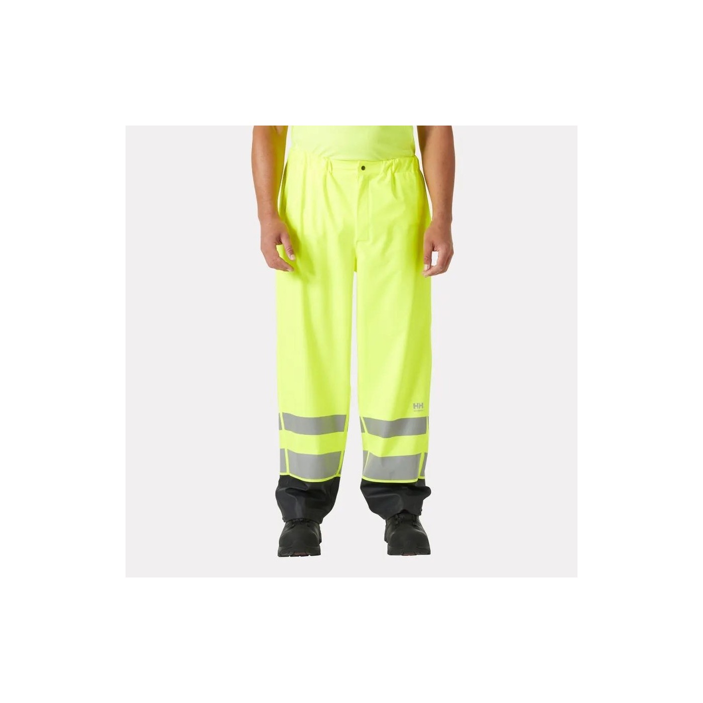 The Addvis high visibility waterproof pants HH 70455 provide certified rain protection (EN 343) and visibility (EN ISO 20471), with a comfortable elastic waistband, durable fabric, and adjustable snap-button hem.