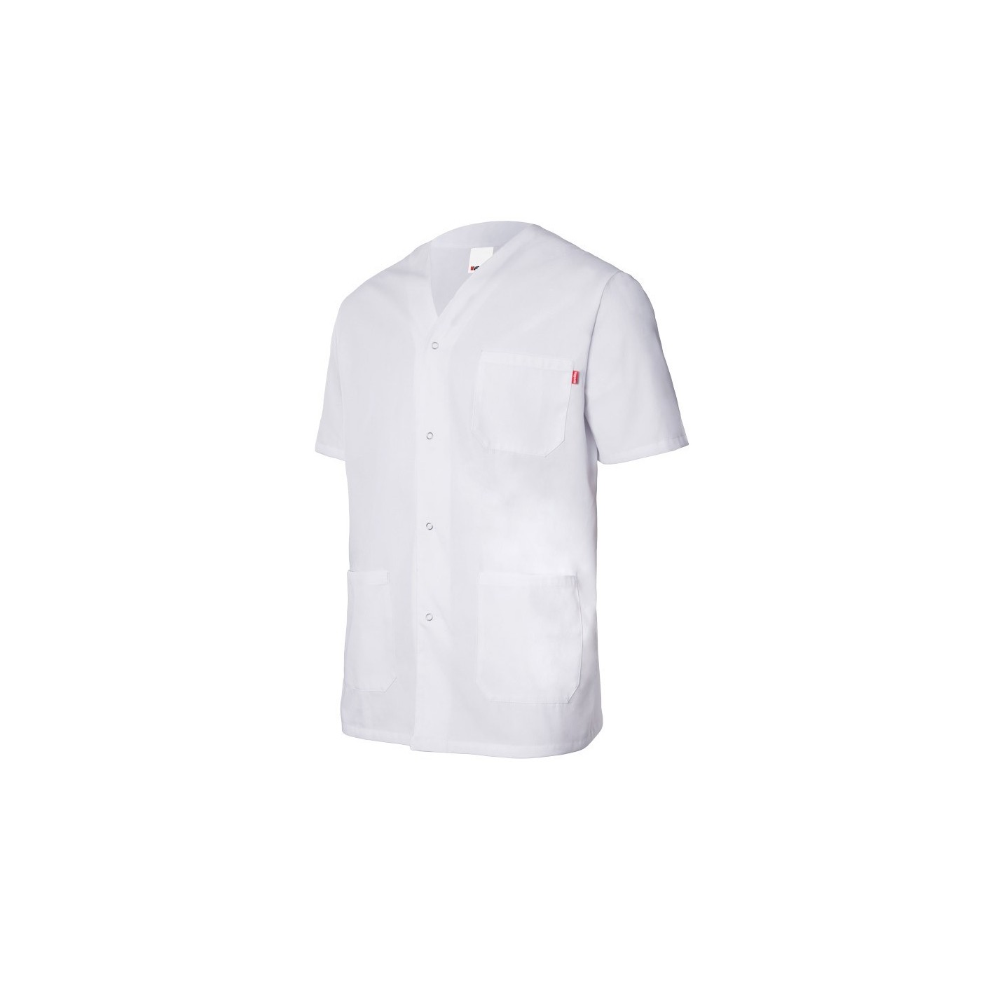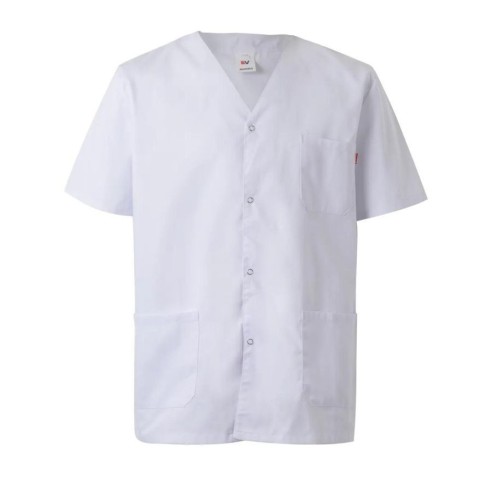 Short-sleeved pyjama jacket with V neck. Central closure with metal poppers and three patched pockets.