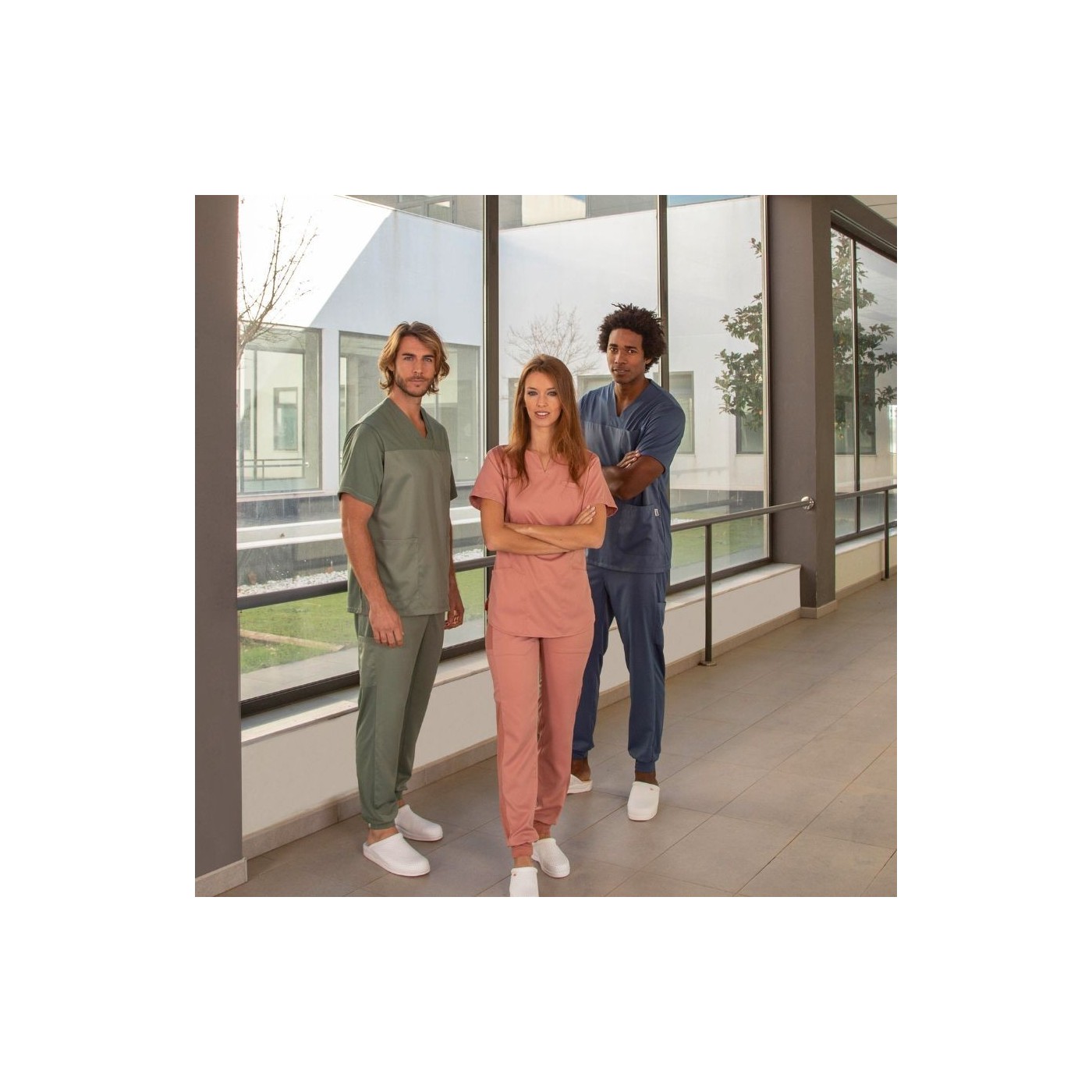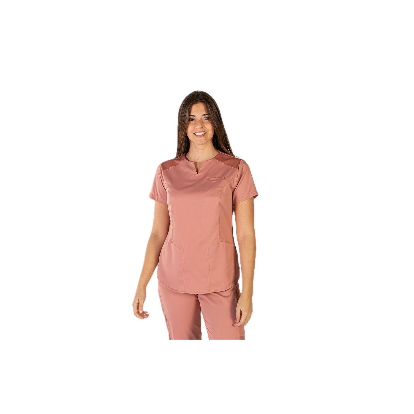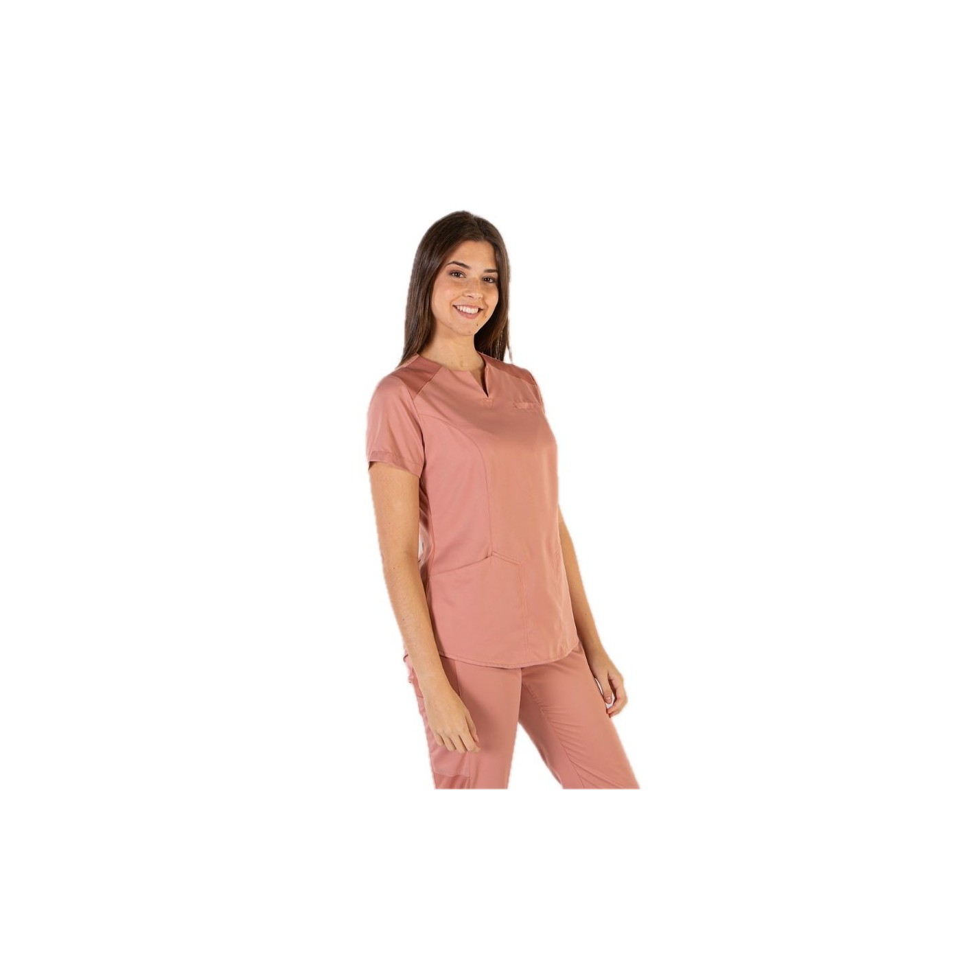 The Lia Peach women's scrub top from Gary’s is the perfect choice for healthcare and food industry professionals. Designed with a semi-fitted cut, it offers comfort and mobility while maintaining an elegant and modern style. Its 100% PEACH polyester fabric provides breathability, splash resistance, and a satin finish that mimics the softness of peach skin.