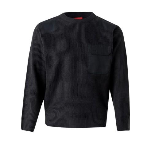 The Velilla Heavy Knit Sweater offers durability and comfort, featuring an anti-pilling treatment, reinforced shoulders and elbows, and a practical Velcro-closure pocket.