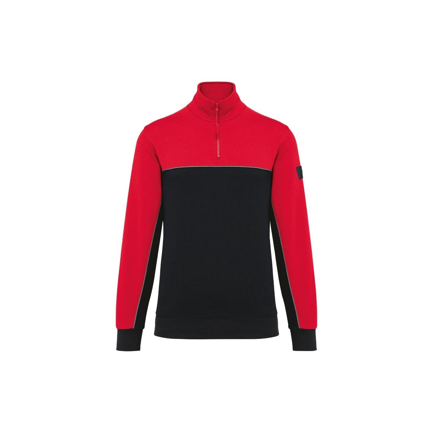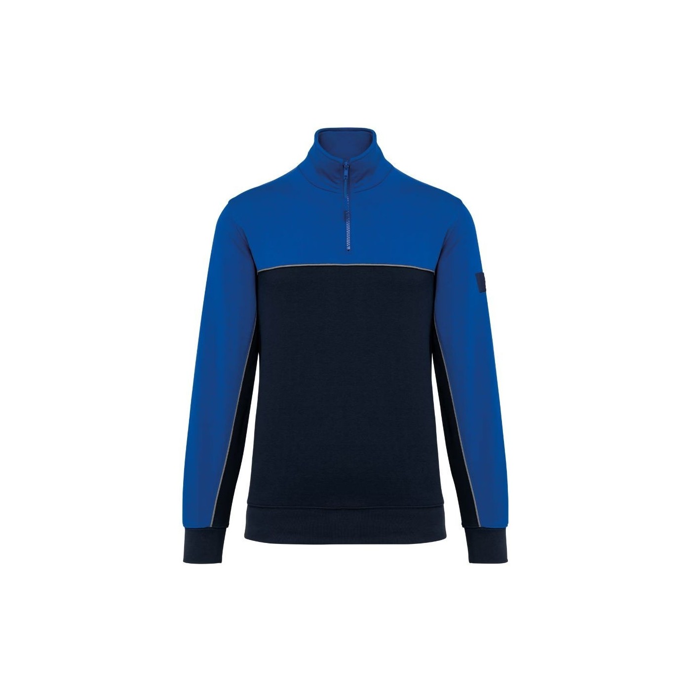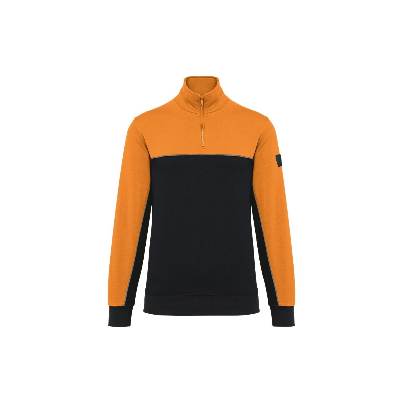 Unisex eco-friendly 1/4 zip sweatshirt by WK, made from brushed fleece 280 g/m² with 60% cotton and 40% recycled polyester. Modern two-tone design, slim fit and practical pen holder on sleeve.