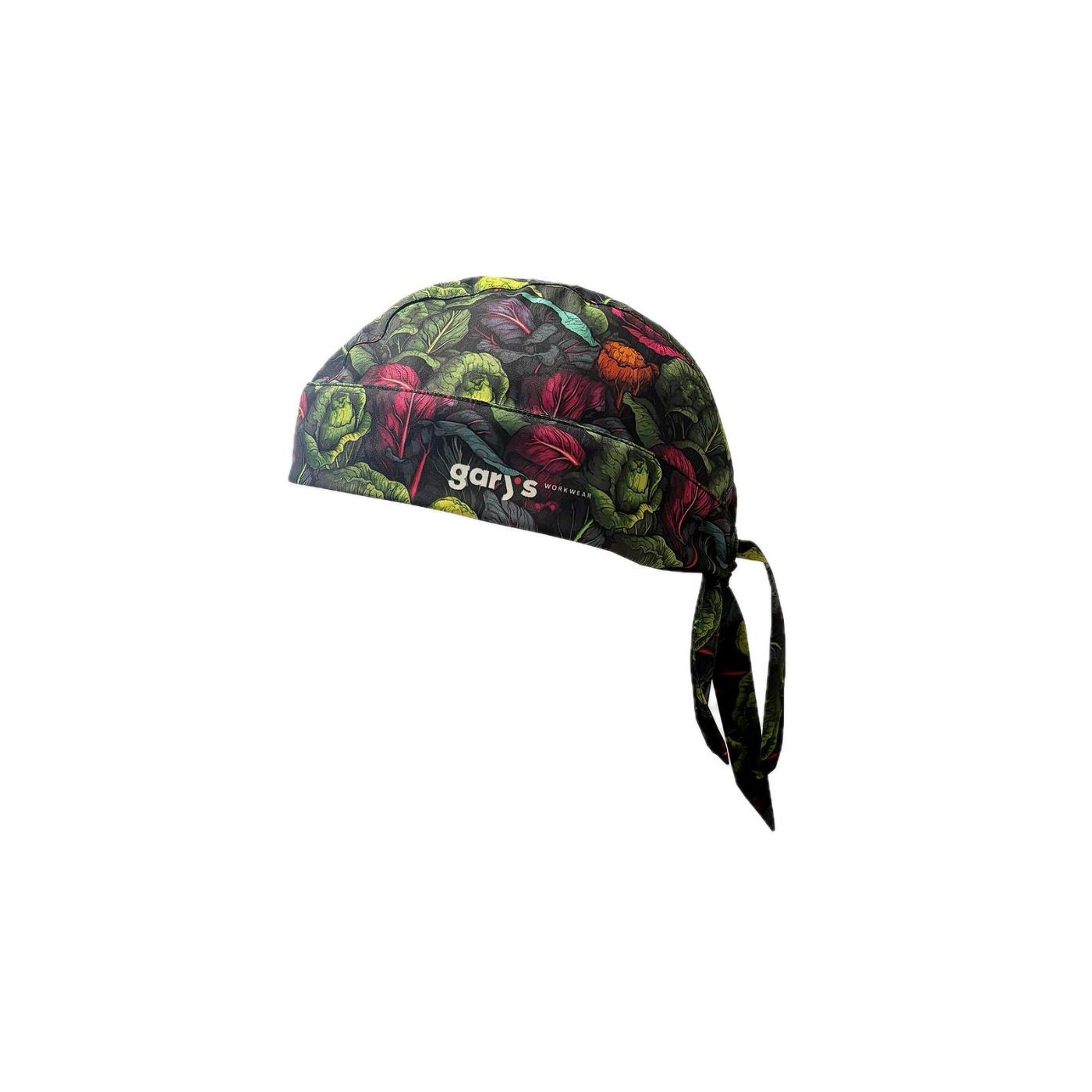 The Gary's Printed Pirate Kitchen Hat in Microfiber is lightweight, breathable, and adjustable with back ties. It features an absorbent terry band on the forehead, sublimated fabric, and vibrant prints.