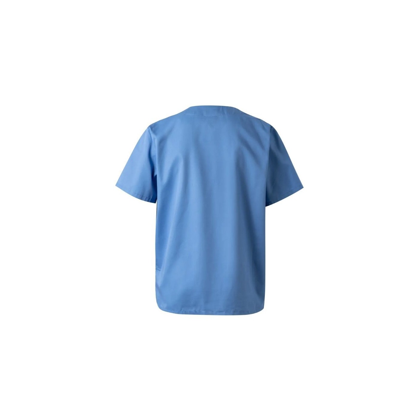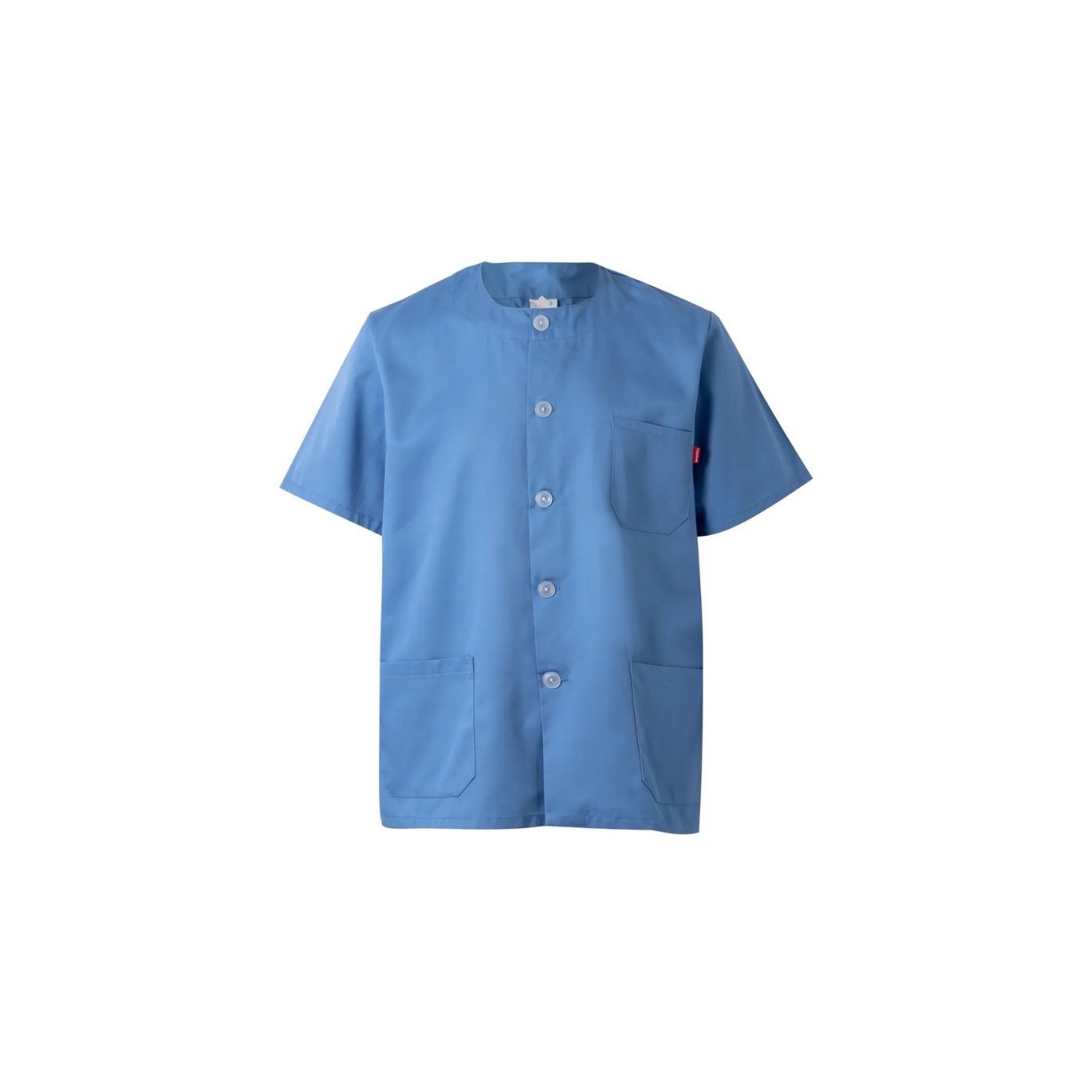 CUELLO REDONDO, MANGA CORTA, ABOTONADA EN EL DELANTERO Y TRES BOLSILLOS. ABERTURAS EN LOS LATERALES PARA MAYOR COMODIDAD.
