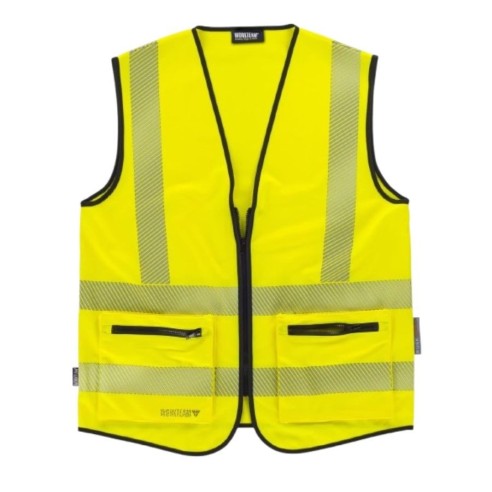 High-visibility vest with segmented reflective tapes, front zipper and gusseted side pockets. Lightweight, practical, and safe.