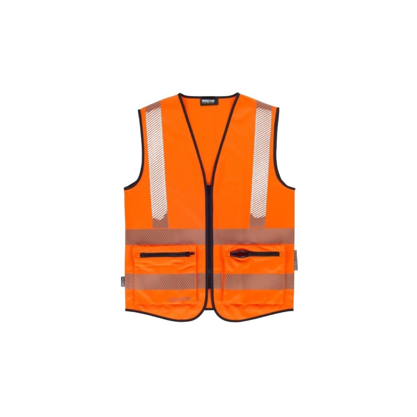 High-visibility vest with segmented reflective tapes, front zipper and gusseted side pockets. Lightweight, practical, and safe.