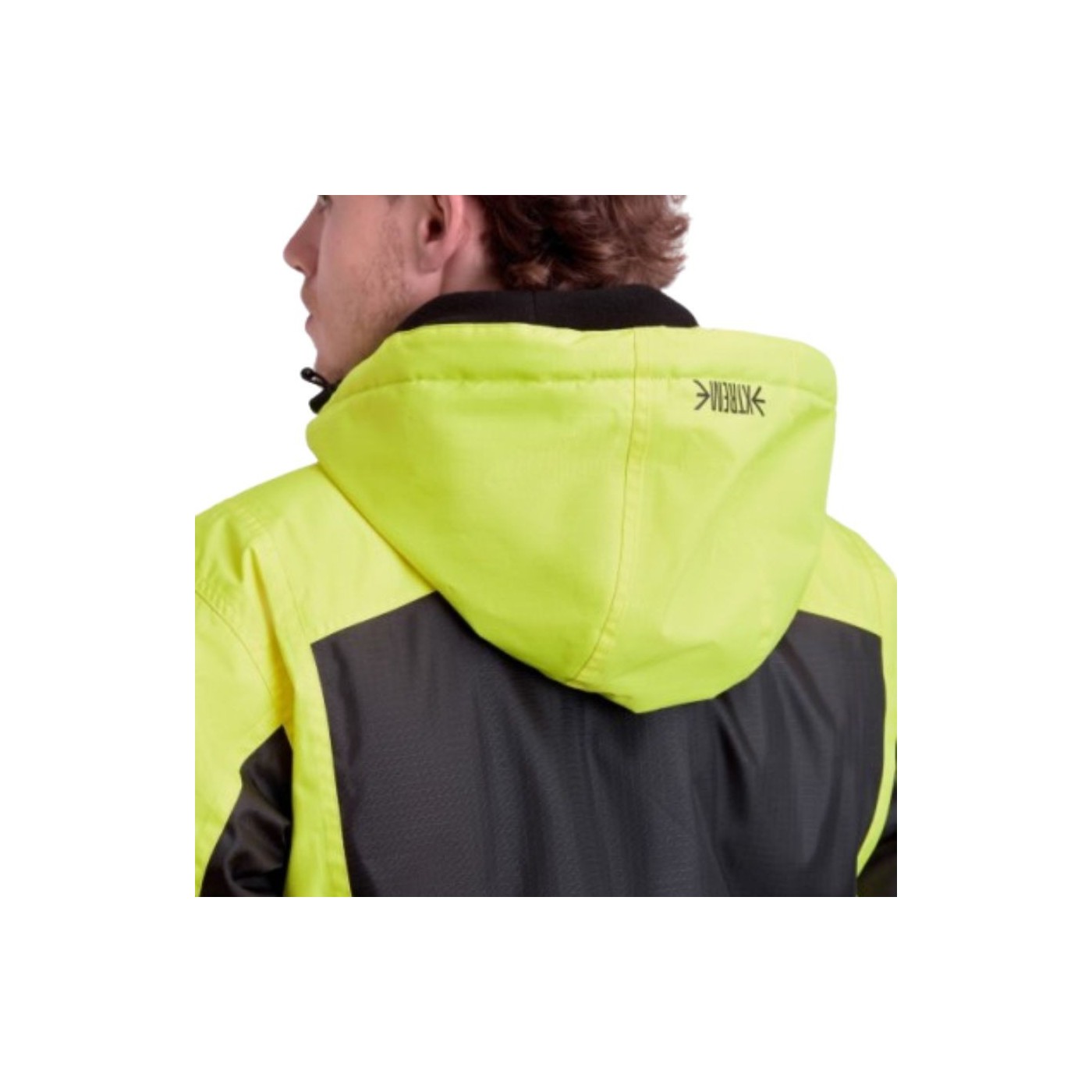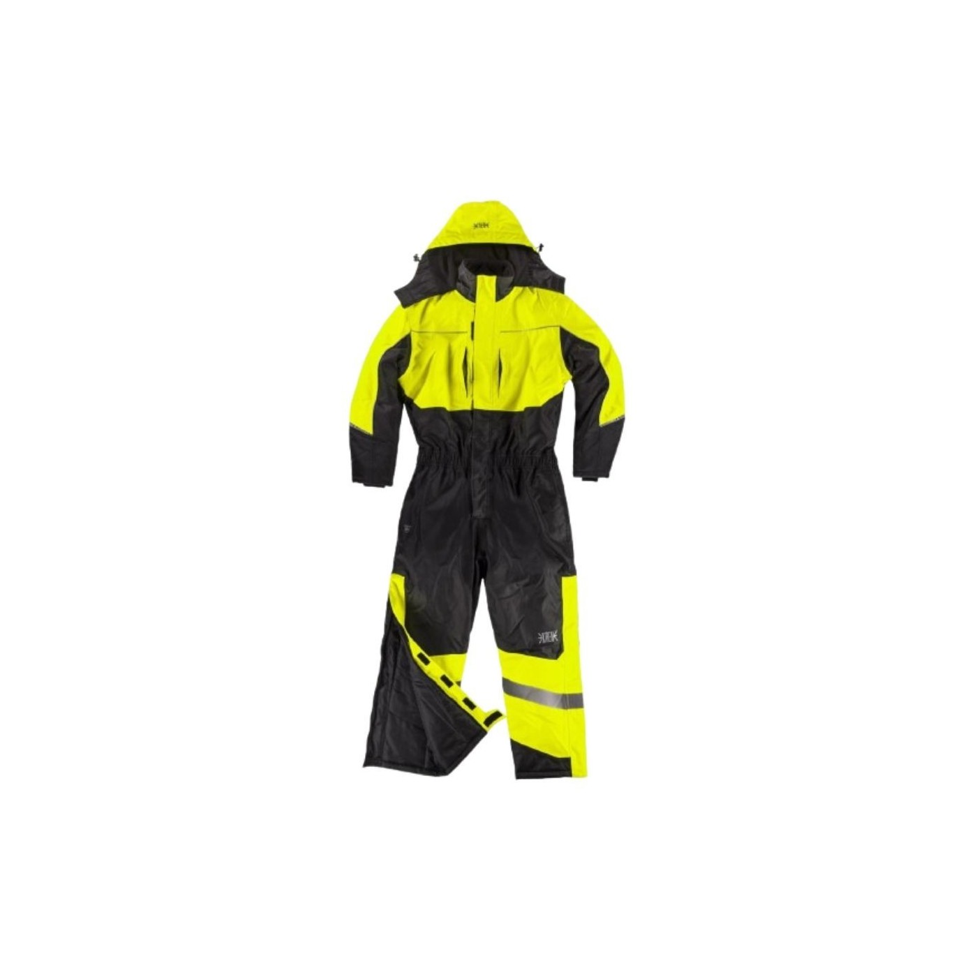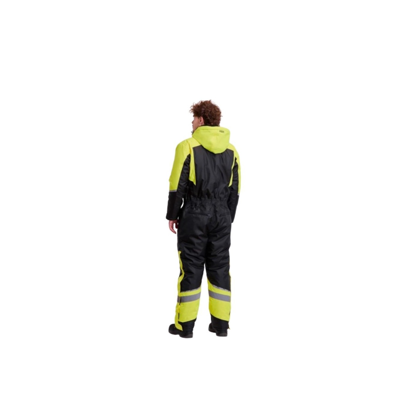 Padded waterproof coverall with Ripstop fabric, fleece-lined adjustable hood, and reflective bands for high visibility. Resistant to -5ºC with multiple functional pockets.